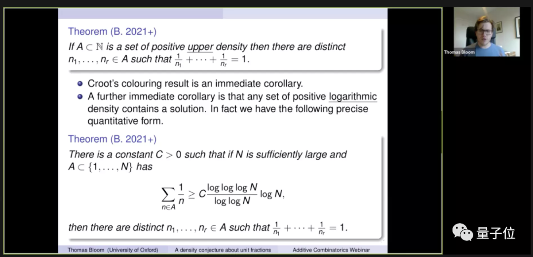 Bloom给出的结论是,并不需要把整数分成若干个有限集合,只要集合满足“正密度”的条件,那么这个集合就存在一组整数倒数和为1。