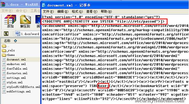 当往该docx的xml文件注入恶意代码(引用外部实体)时,可进行XXE攻击。