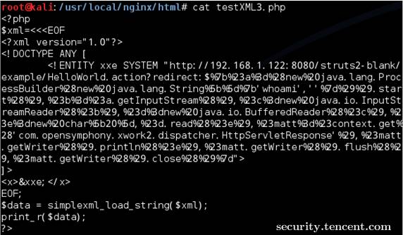 该CASE是读取/etc/passwd,有些XML解析库支持列目录,攻击者通过列目录、读文件,获取帐号密码后进一步攻击,如读取tomcat-users.xml得到帐号密码后登录tomcat的manager部署webshell。