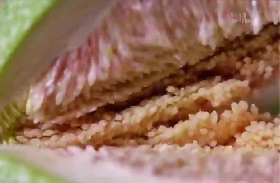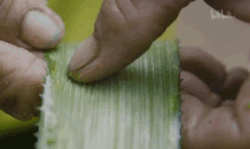 采摘完的爱玉要马上削皮、剖开。由于果实中富含果胶,去皮后的表面会分泌出一种乳白色的粘液。有意思的是,爱玉果作为一种隐花果,果实内部整齐排列的细小颗粒才是它真正的果实,被称为“瘦果”。
