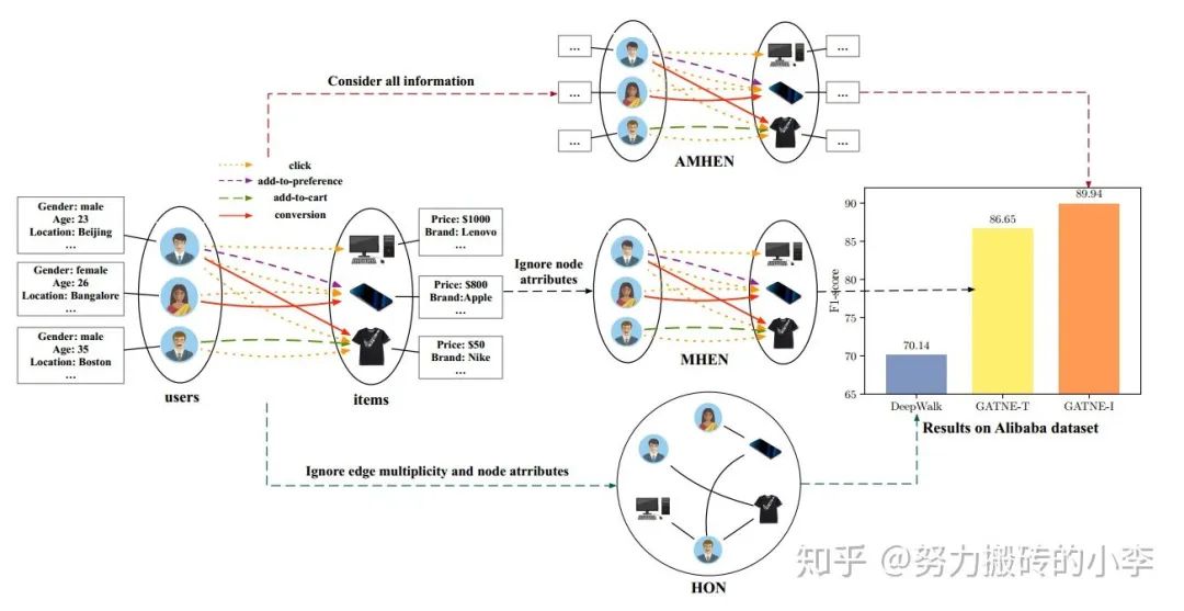 下图为Attributed Multiplex heterogeneous network,左边一部分是具有节点性质的用户,用户特征包括性别、年龄、位置等,item特征包括价格、品牌等,边特调整包括点击、添加到喜欢等。中间部分表示三种方法建模:AMHEN(Attributed Multiplex Heterogeneous Network),MHEM(Multiplex Heterogeneous Network),HON(Homogeneous Network),右图是建模结果,可以看出,AMHEN(考虑多种类型,节点性质的异构图网络),优于MHEN(不考虑节点性质的异构网络),优于HON同构网络。