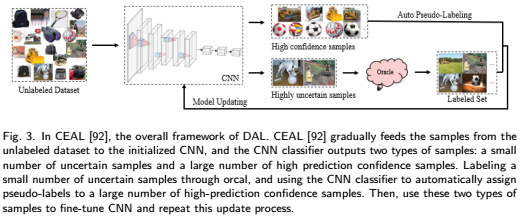 CEAL将来自未标注数据集中的样本逐步送入到初始化后的CNN,由CNN分类器输出两种类别的样本:少量不确定性的样本和大量高预测置信度样本。通过orcal为少量不确定性样本进行标注,同时使用CNN分类器为大量的高预测置信度样本自动分配伪标签。然后,使用这两种类型的样本对CNN进行微调,并重复这个更新过程。