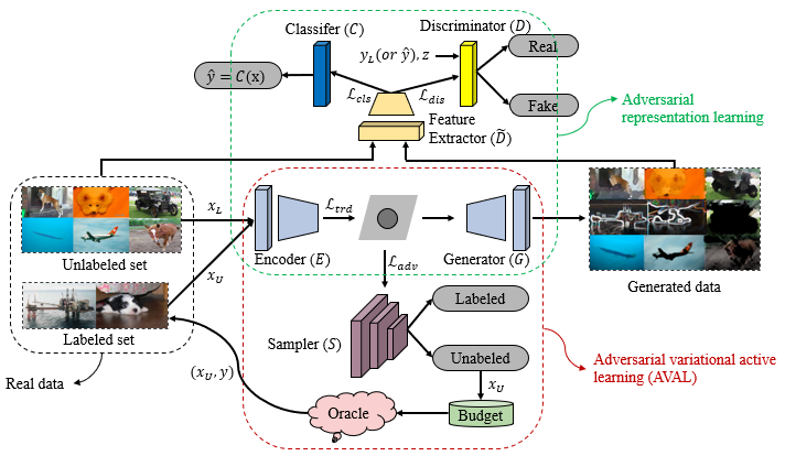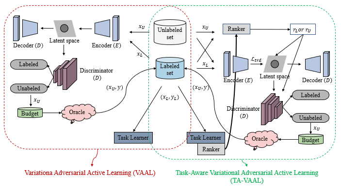 VAAL,ARAL和TA-VAAL的结构对比。 1)VAAL使用标记数据和未标记数据采用半监督的方式来学习数据的潜在的表示空间,根据潜在空间选择信息量最大的未标记数据进行标注。 2)TA-VAAL拓展了VAAL,将损失预测模块和RankCGAN整合到变分对抗主动学习(VAAL)中,以便同时考虑数据分布和模型不确定性。 3)ARAL也拓展了VAAL,ARAL不仅使用了真实数据集(由标注数据集和未标注数据集组成)和还使用了生成数据集来共同训练网络。整个网络由编码器、生成器、鉴别器、分类器和采样器构成,模型的所有部分被共同训练。更多的细节可以查看ARAL。