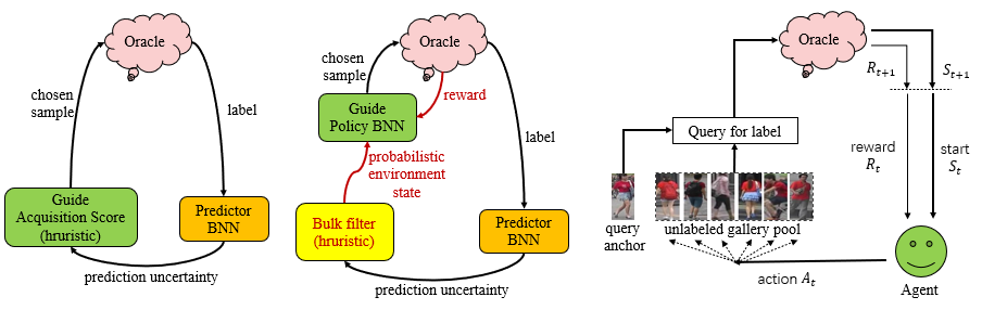 标准的AL,RAL and DRAL的管道对比。 (a)标准的AL管道通常由三个部分组成。Oracle提供一组标记数据,预测器(此处为BNN)用来学习这些数据,并为指南提供了可预测的不确定性,该指南通常是固定的,硬编码的获取函数,它为Oracle挑选下一个样本从而重新开始循环。 (b)RAL用策略BNN代替固定获取函数,该策略BNN以概率状态进行学习,并从oracle获得反馈,以强化学习的方式学习如何选择下一个最优的样本点(红色的新部分)。因此,RAL可以更加灵活地调整获取函数以适应现有的数据集。 (c)DRAL为person Re-ID任务设计了一个深度强化主动学习框架。对于每个查询锚点(探针),代理(增强型主动学习者)将在主动学习过程中从图库池中选择实例交给oracle以获得带有二进制反馈(正/负)的人工注释。状态评估所有实例之间的相似关系,根据oracle的反馈计算奖励从而调整代理的查询。