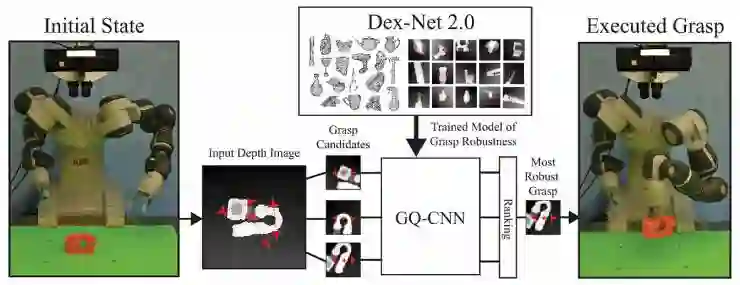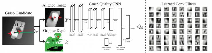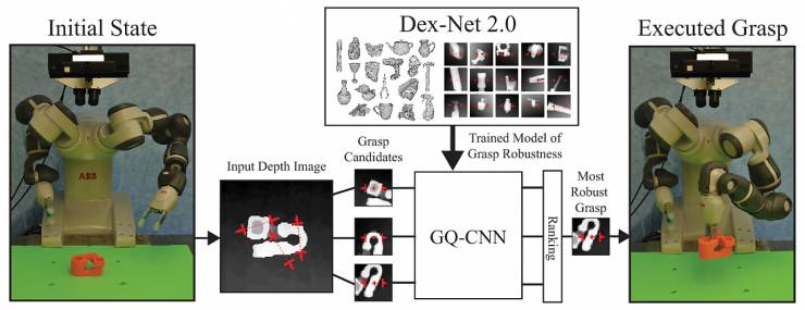 研究人员们开发了一种深度抓取质量卷积神经网络(GQ-CNN)模型,并在Dex-Net 2.0上对它进行训练,用候选抓取规划和点云估算抓取的鲁棒性(grasp robustness)。
