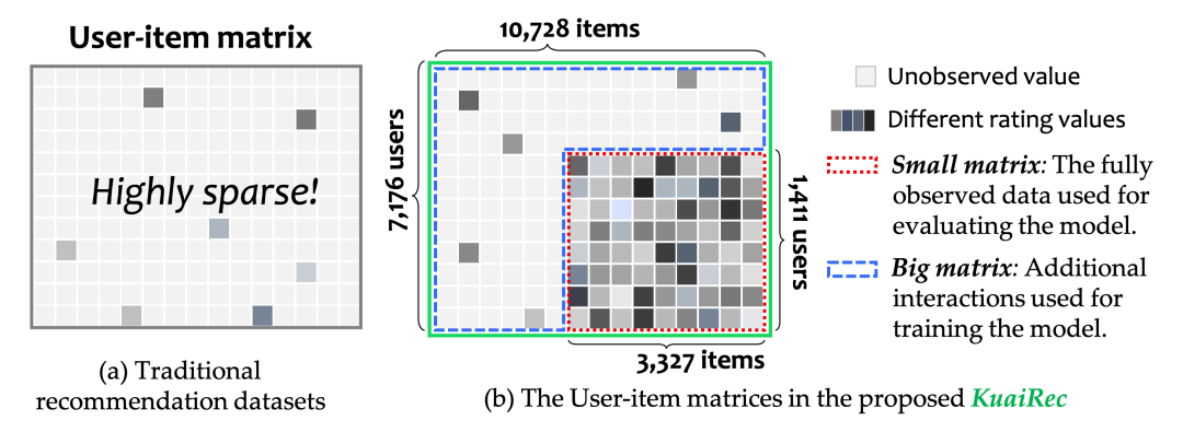 首先,要想得知任一用户对任意推荐商品的喜好,传统的推荐数据做不到,过于稀疏了。而我们在快手App上收集了一个全曝光的数据,解决了这个问题。见下图红色的小矩阵部分,1411个用户对3327个视频的偏好全部已知。