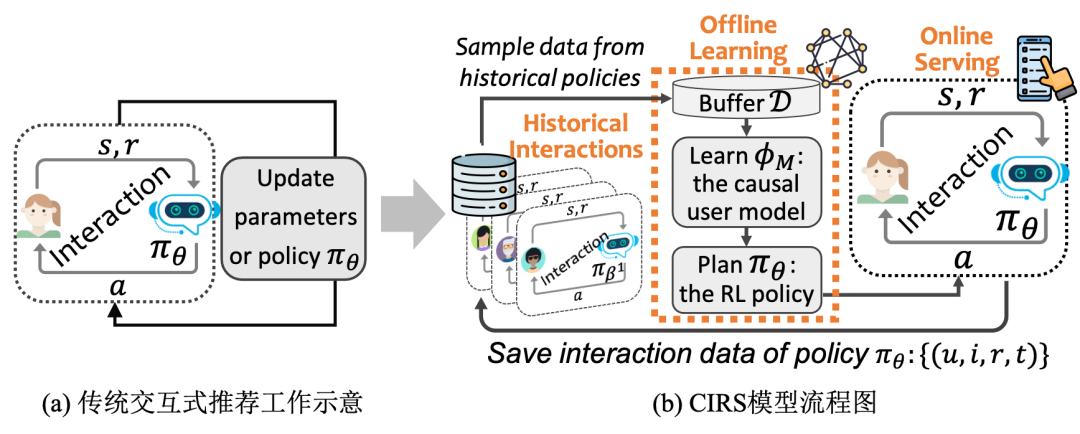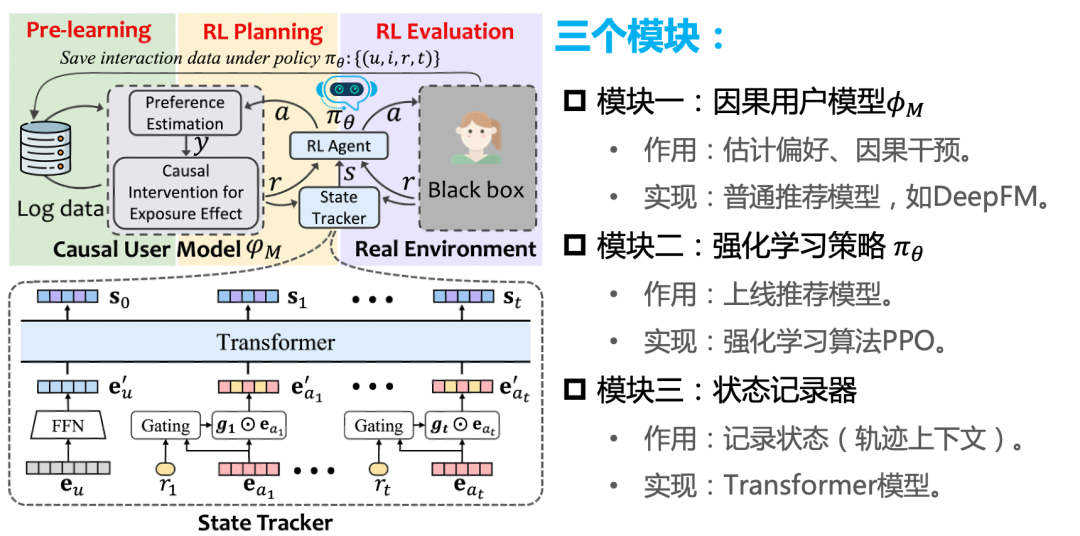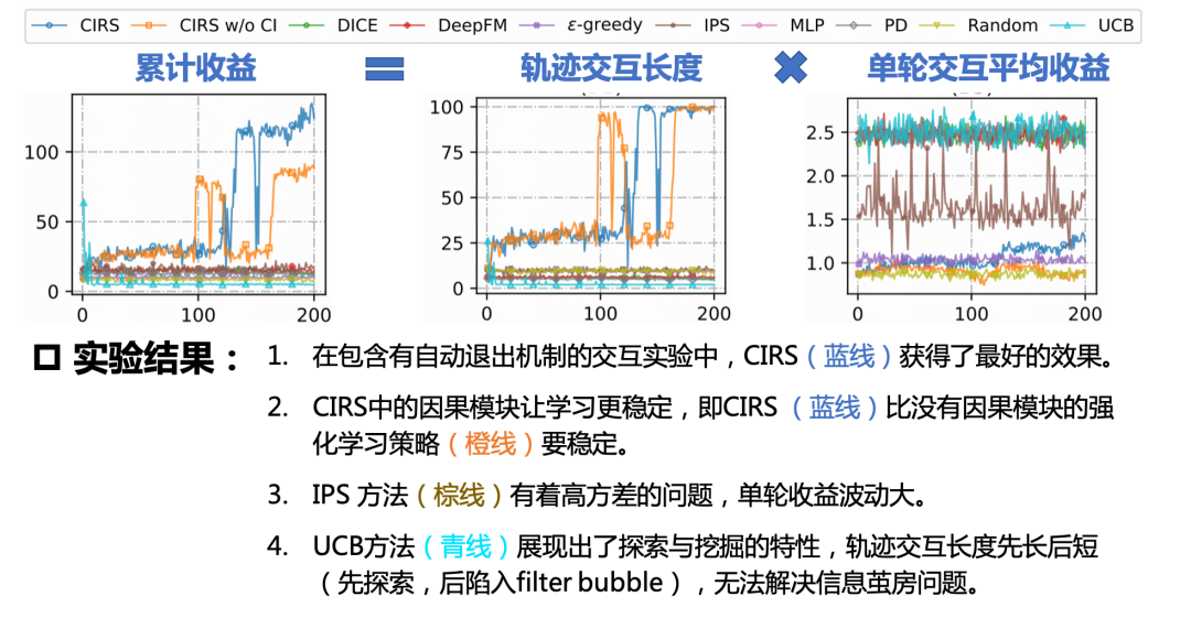 下图右边给出了我们提出的CIRS模型的流程。主要分为两步,学习一个因果用户模型(causal user model),再学一个强化学习的策略 。这就是一个强化学习模型的流程。