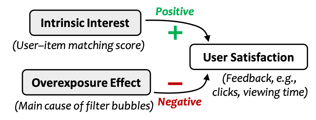 根据上一小节的讨论,我们能够建模,用户满意度与内在兴趣正相关,与过曝光效应负相关。如下图所示。
