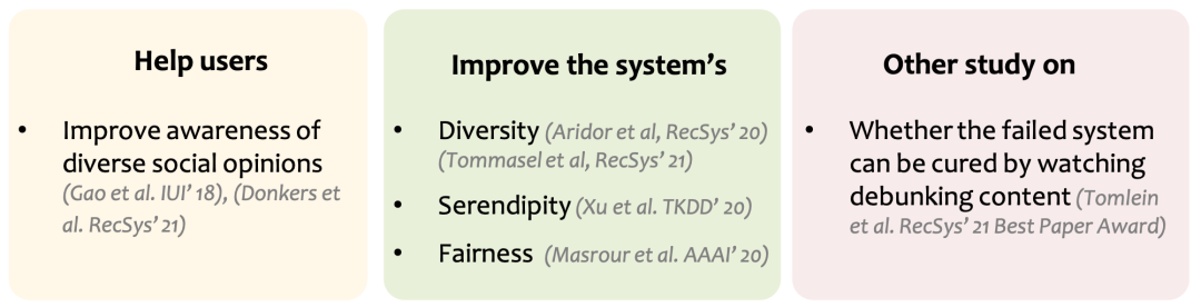 最直观的方式有提升推荐结果的多样性(diversity)、新颖性(serendipity)等,通过各种规则(rule)来干预推荐结果,使其不陷入单调的境地。下图总结了一些在推荐系统中常见的策略,详情可以参考我们论文引用部分。