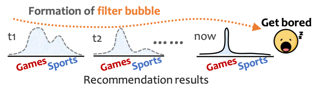 下图展现出了一个信息茧房的例子,当推荐系统从一开始的多元到之后的过分单一,用户难免感到腻烦。