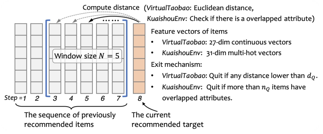 下图给出了一个退出的机制的示意图,除了上文提到的快手数据以外,我们还用了VirtualTaobao这个强化学习的交互环境。