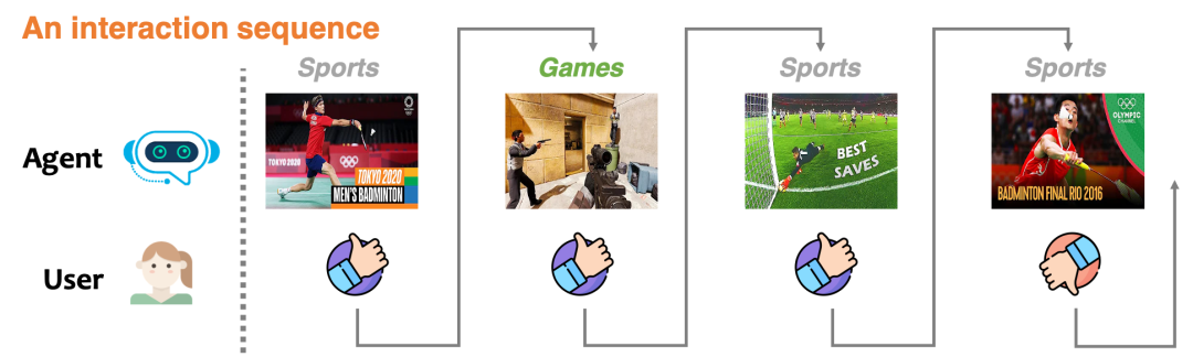 这个机制如何模拟呢?具体来说,在上述收集的全曝光的小矩阵数据上,我们从真实的1411个用户中随机采样并与训练好的交互式推荐策略模型进行交互。在推荐策略返回推荐结果,即从3327个商品中任一推荐一个商品后,我们查询小矩阵数据的对应的用户喜好值并如实返回作为监督信号,这个过程将一直重复。此外,我们指定一个使得交互中止的规定:即如果当前推荐的商品与最近 轮推荐的商品中有超过阈值 个商品有着相同的类目,例如都是美食类,则交互退出。