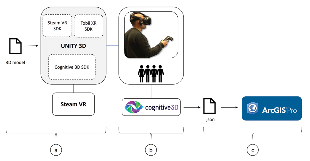 研究者通过集成不同的产品来开发工作流程:首先在虚拟现实环境中测量用户的视觉注意力;然后生成数据输出以导出到第三方软件;最后将处理过的数据导入3D与「位置信息系统」的环境中。