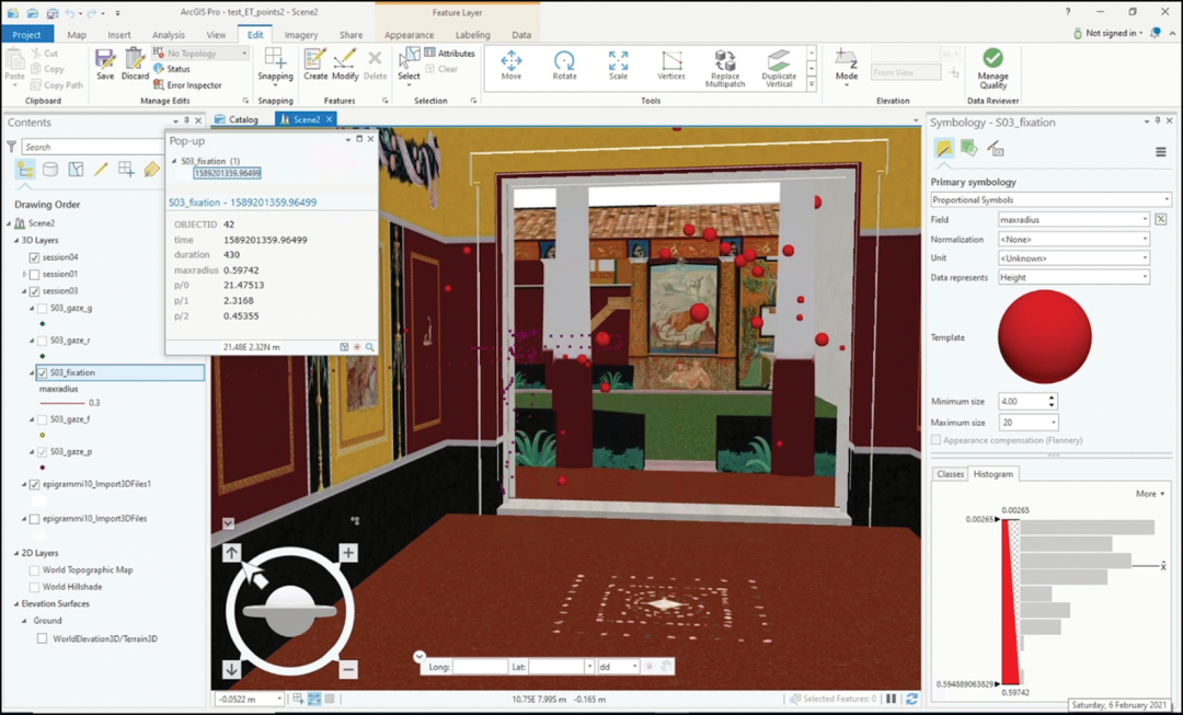 在GIS空间中处理源自虚拟现实眼动仪的数据,可能会为研究和分析人与VR交互提供有趣的新场景(例如,发现光线照明如何影响涂鸦和壁画等元素的观看体验)。