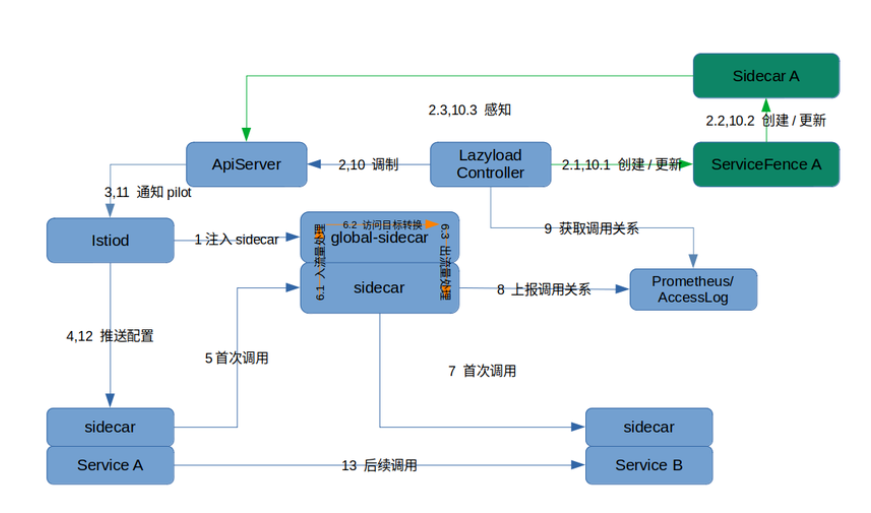 懒加载模块就是用于解决上述问题。懒加载可自动对接服务网格,在转发过程中支持 Istio 所有网络治理能力,无性能问题。它可以帮助业务人员使用了 SidecarScope,而无需直接管理它。