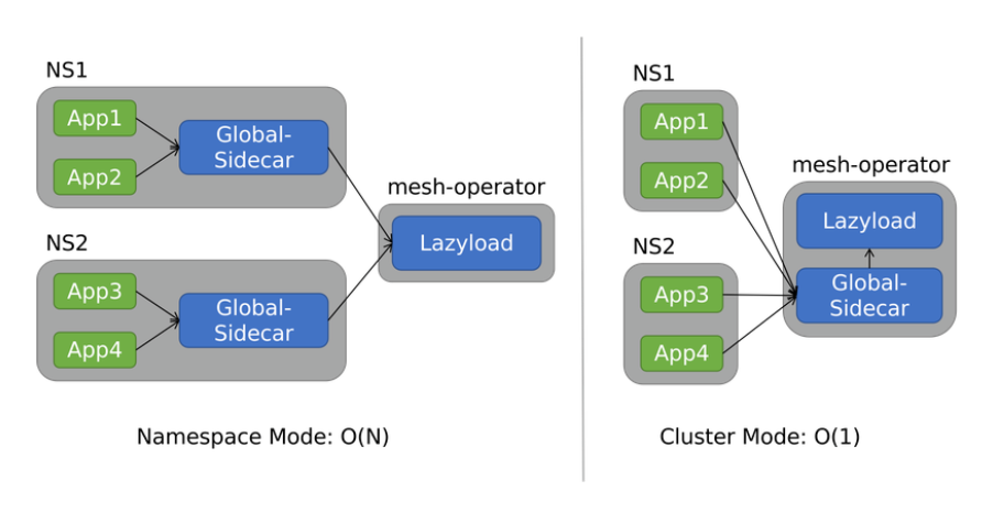 懒加载模块有两种使用模式,Namespace 模式和 Cluster 模式。两种模式中,Lazyload Controller 都是全局唯一的,不同点在于前者的 Global-sidecar 是 Namespace 级别,后者是 Cluster 级别。如下图所示