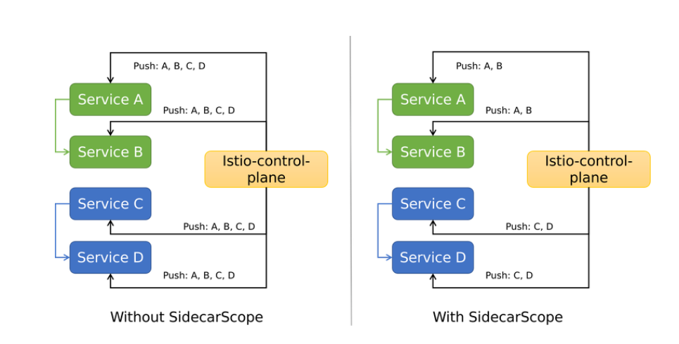 于是,Istio 1.1 版本提供了解决方案 - Sidecar CRD (本文会称之为 SidecarScope,以和 Envoy 实现的 SidecarProxy 做区分)。用户可以在 SidecarScope 中描述 SidecarProxy 需要关心的服务信息,借此屏蔽无关的服务配置下发。结果如上图右侧所示,服务配置了 SidecarScope 后,收到的配置精简了,不再包含无关的配置。同时,不相关服务的配置变化也不会再通知,减少了推送频率。