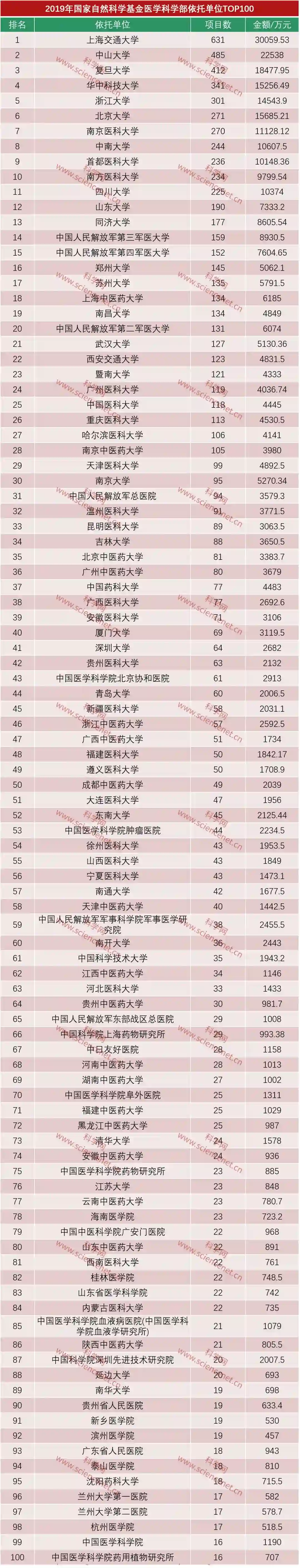 从统计数据来看,医学科学部依托单位获批项目数量排名前5名为:上海交通大学631项,中山大学485项,复旦大学412项,华中科技大学341项,浙江大学301项。