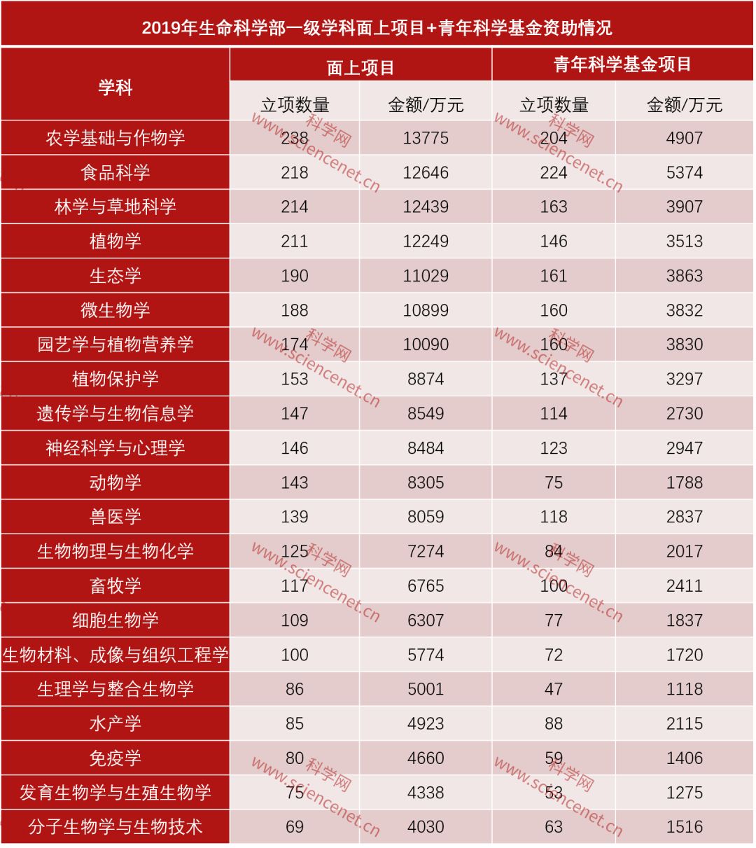 整理了一下2019年生命科学部一级学科的面上项目、青年科学基金项目的资助情况,面上项目和青年科学基金项目资助数量前3名均为:农学基础与作物学、食品科学、林学与草地科学。