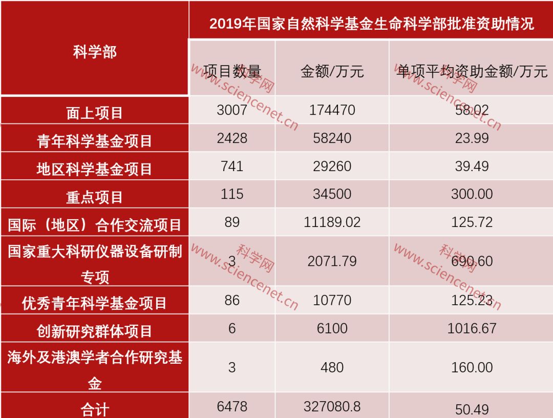 2019年度,生命科学部获自然科学基金委批准资助6478项(不含杰出青年基金项目),批准资助金额共计32.71亿元,单项平均资助金额50.49万元。