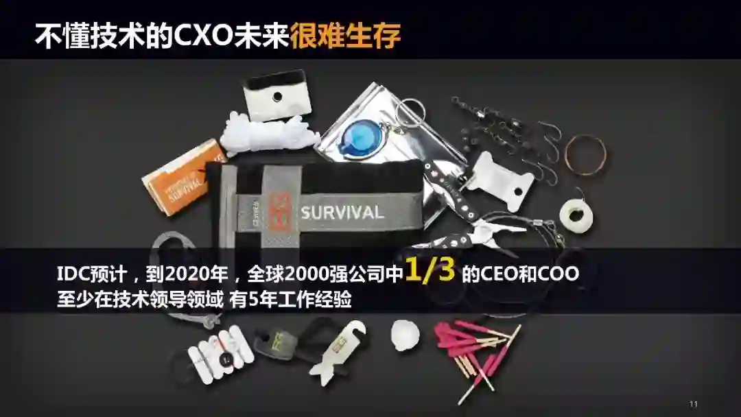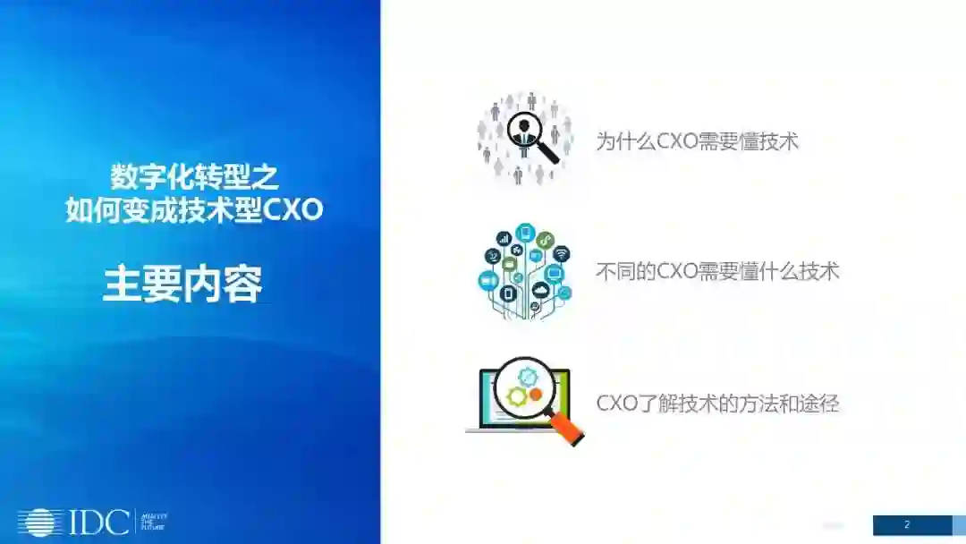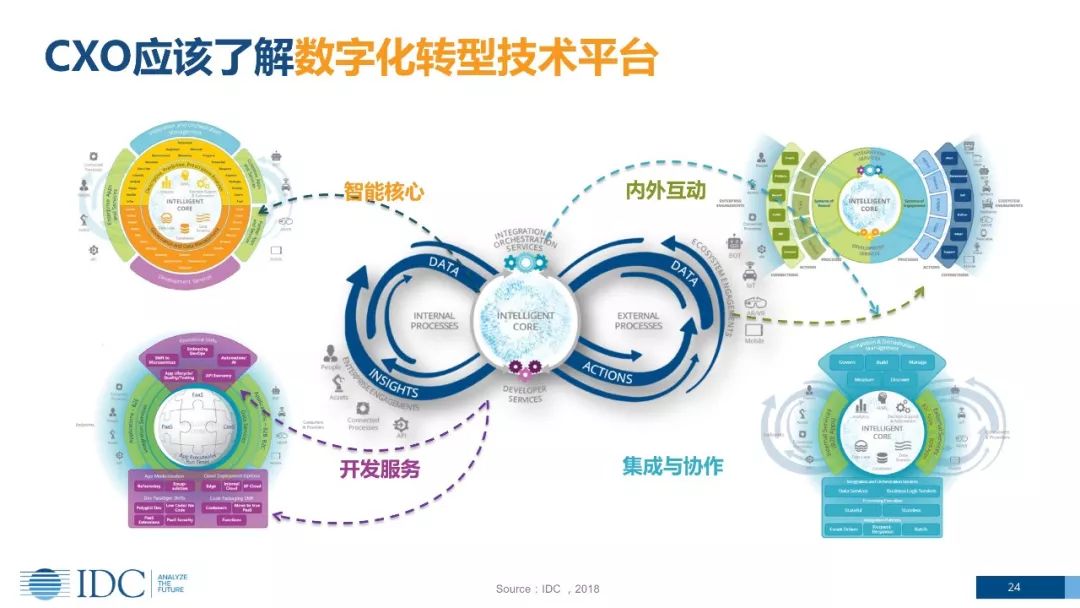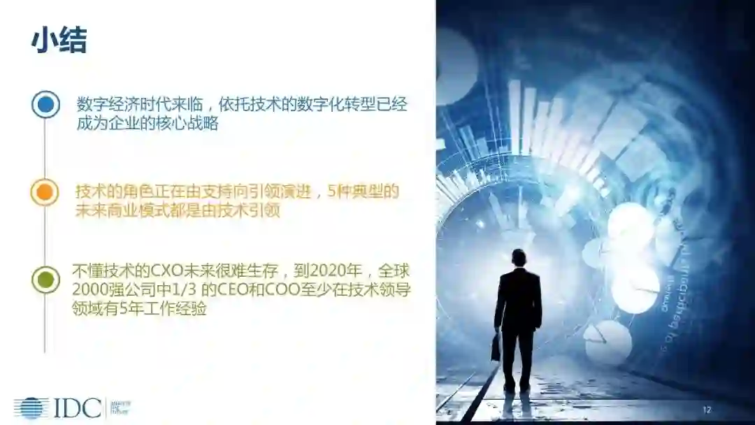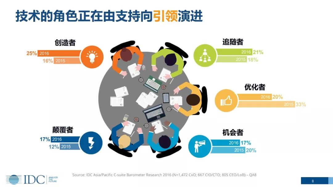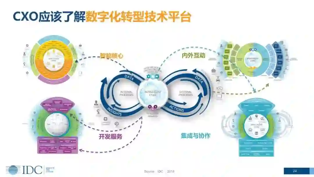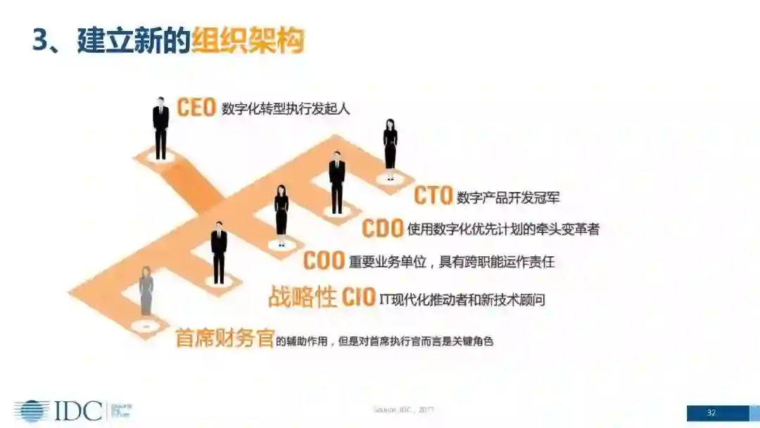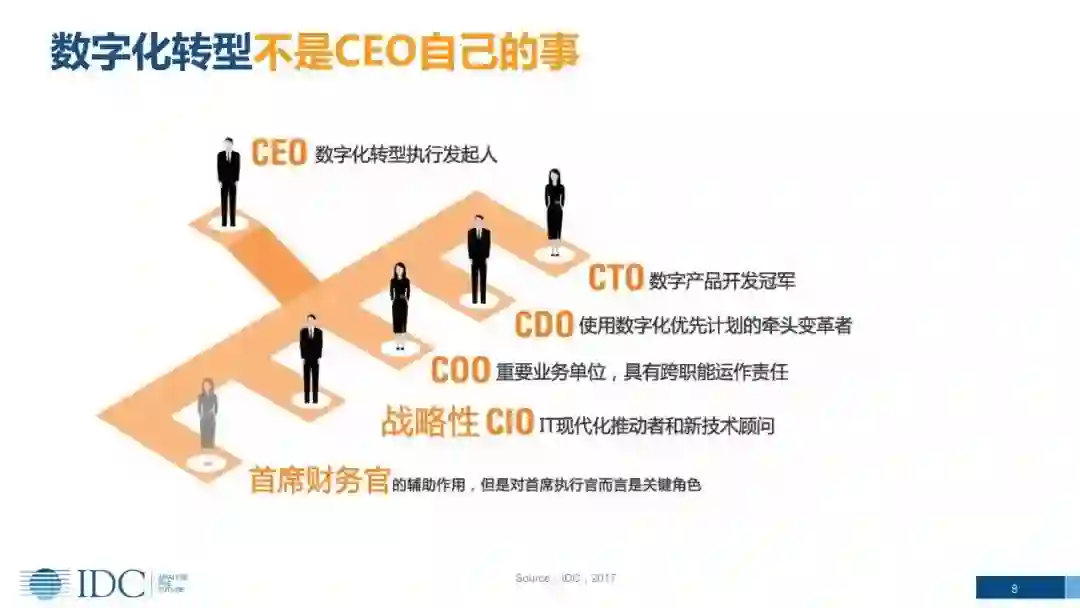 数字化转型是技术支持的业务转型,CXO变成技术型至关重要。IDC预计,到2020年,全球2000强公司中1/3 的CEO和COO等至少在技术领导领域有5年工作经验 。