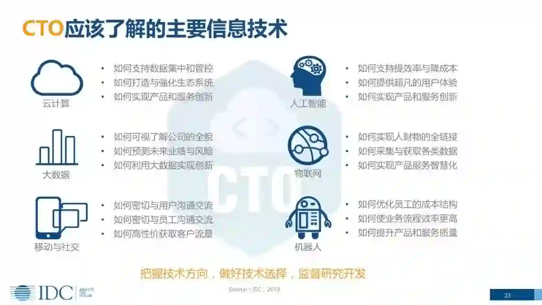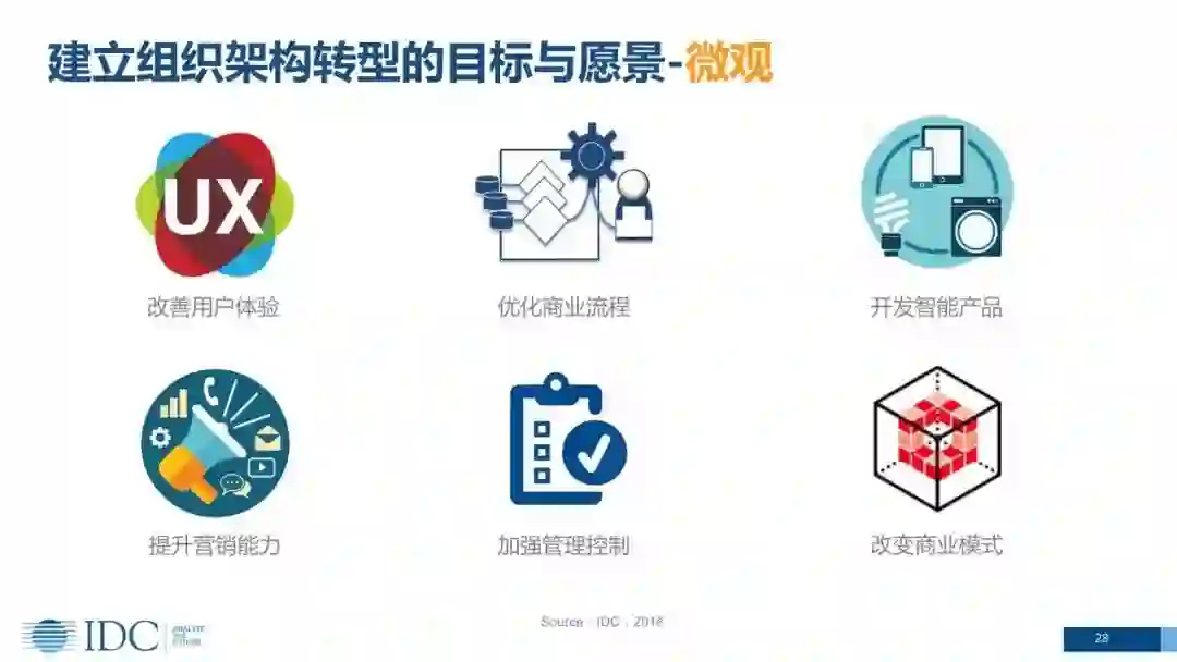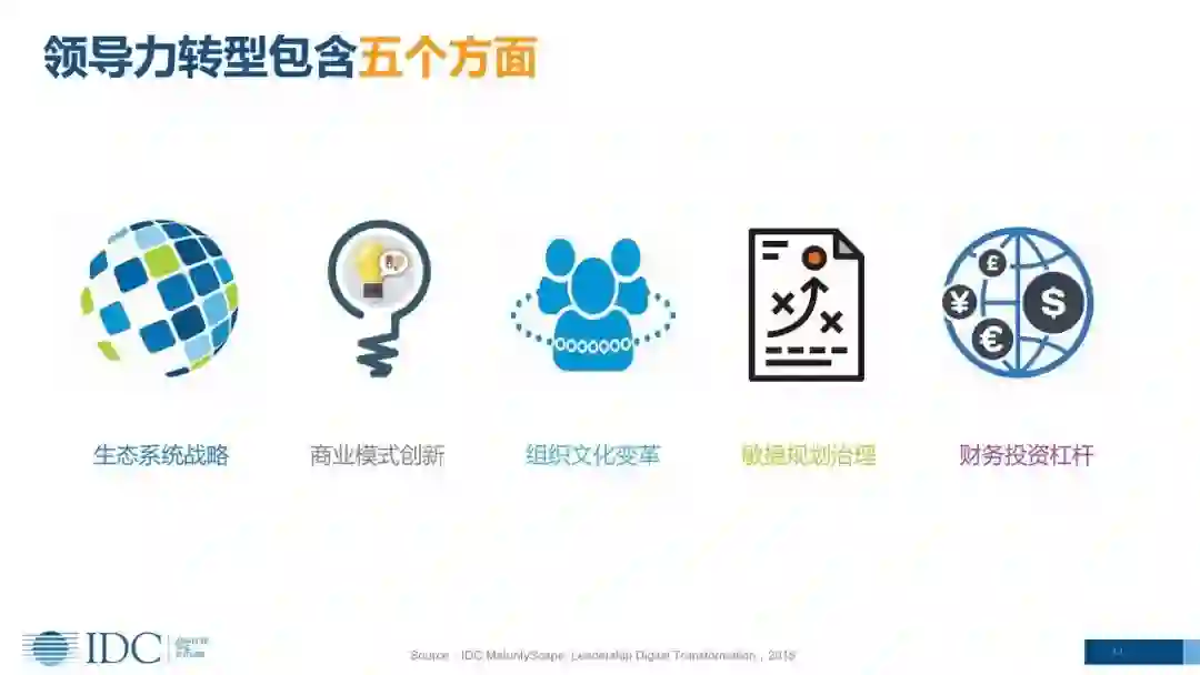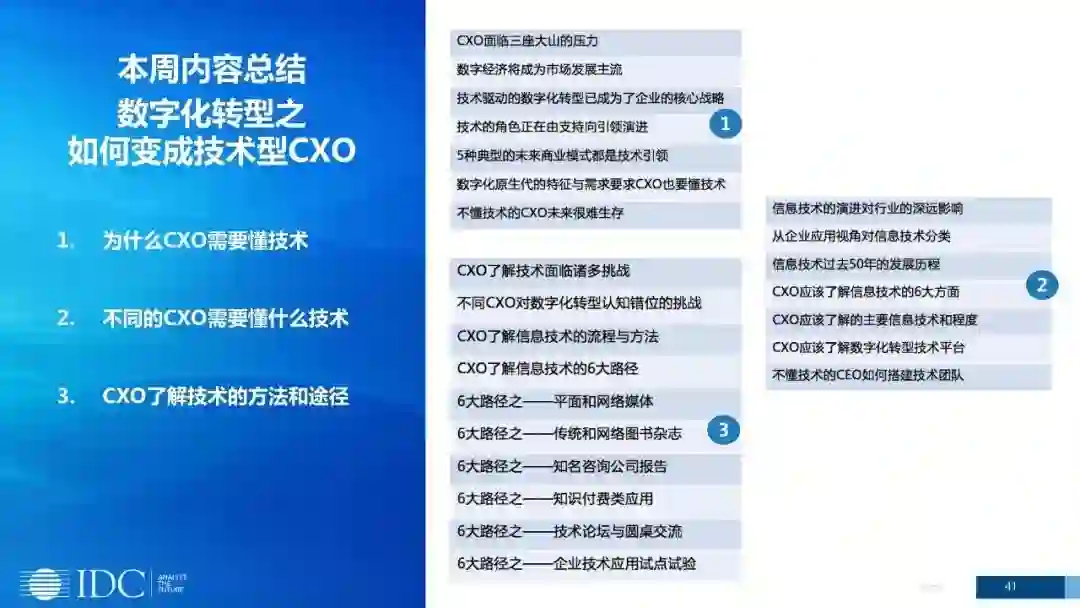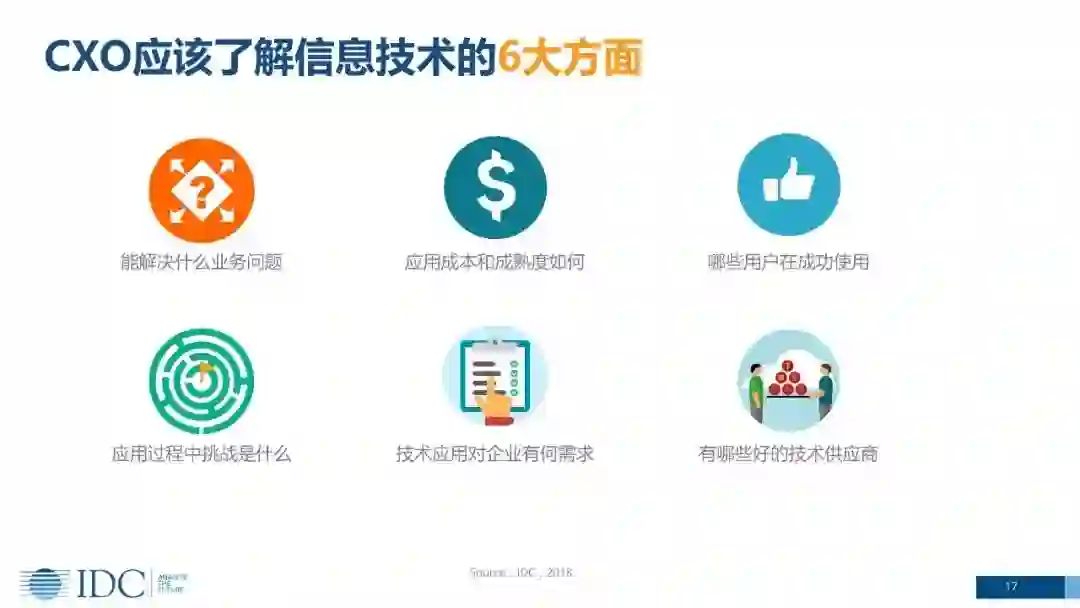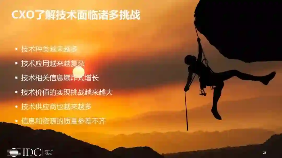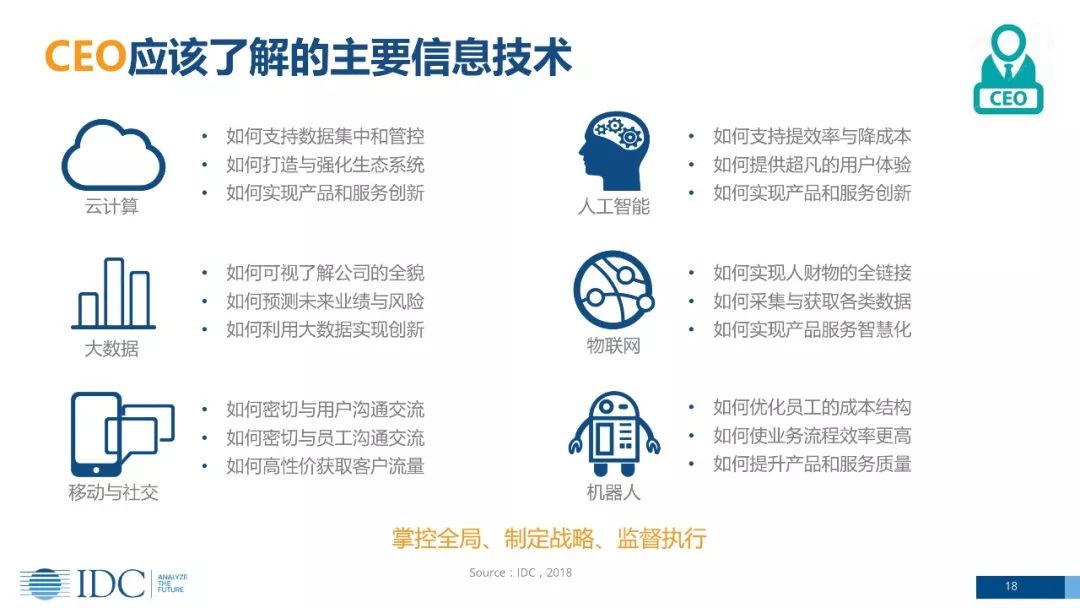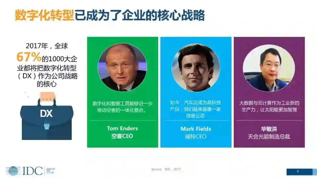数字化转型是技术支持的业务转型,CXO变成技术型至关重要。IDC预计,到2020年,全球2000强公司中1/3 的CEO和COO等至少在技术领导领域有5年工作经验 。