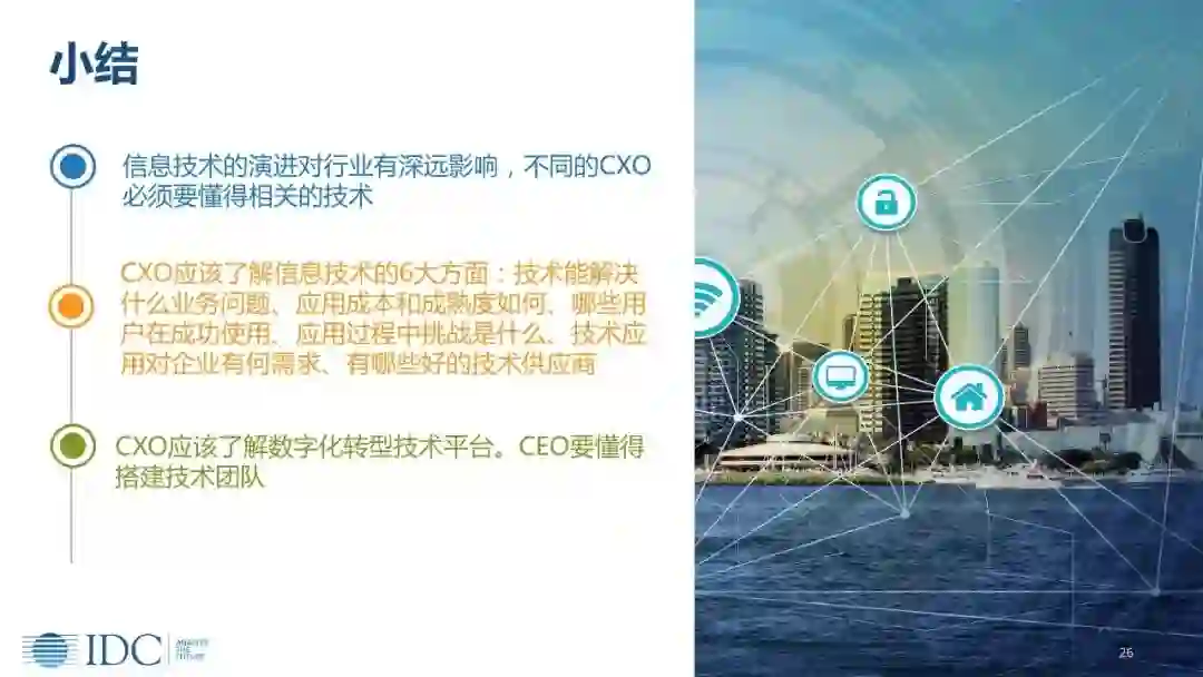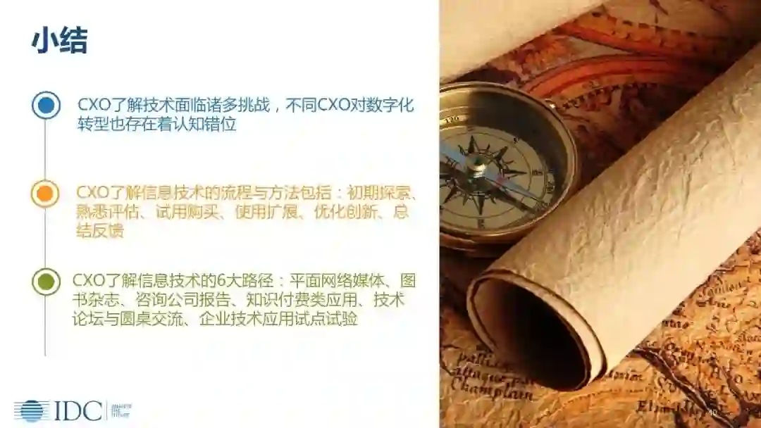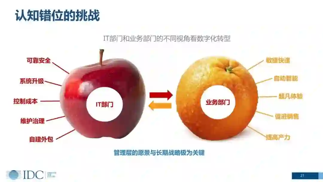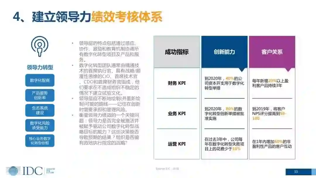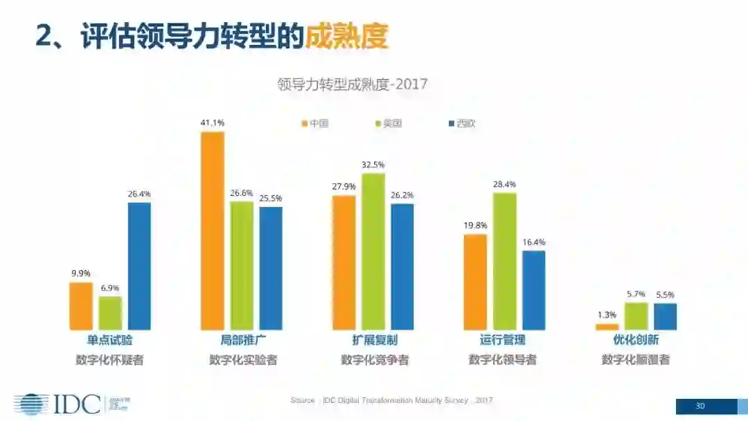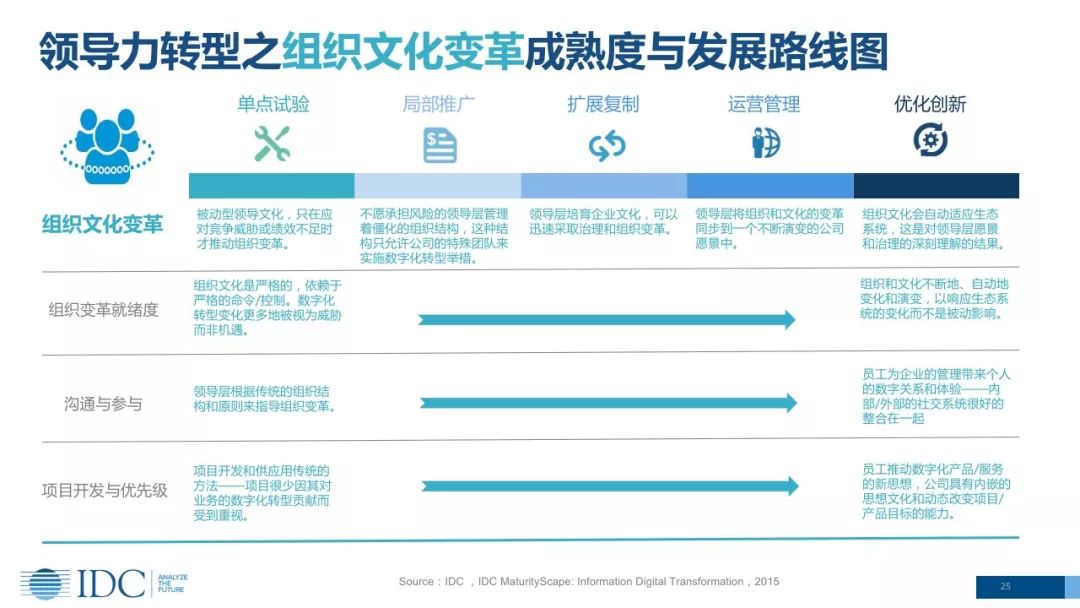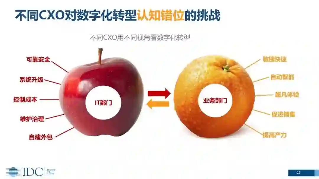 数字化转型是技术支持的业务转型,CXO变成技术型至关重要。IDC预计,到2020年,全球2000强公司中1/3 的CEO和COO等至少在技术领导领域有5年工作经验 。