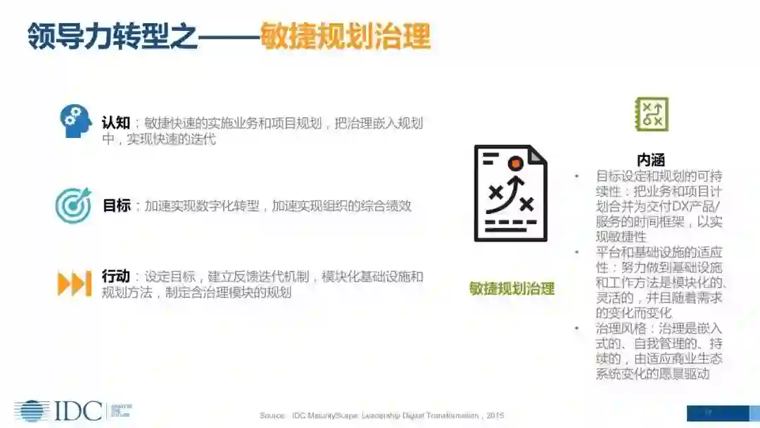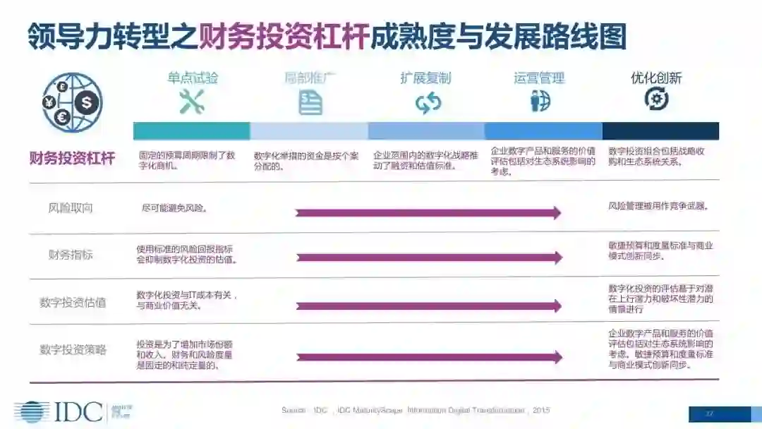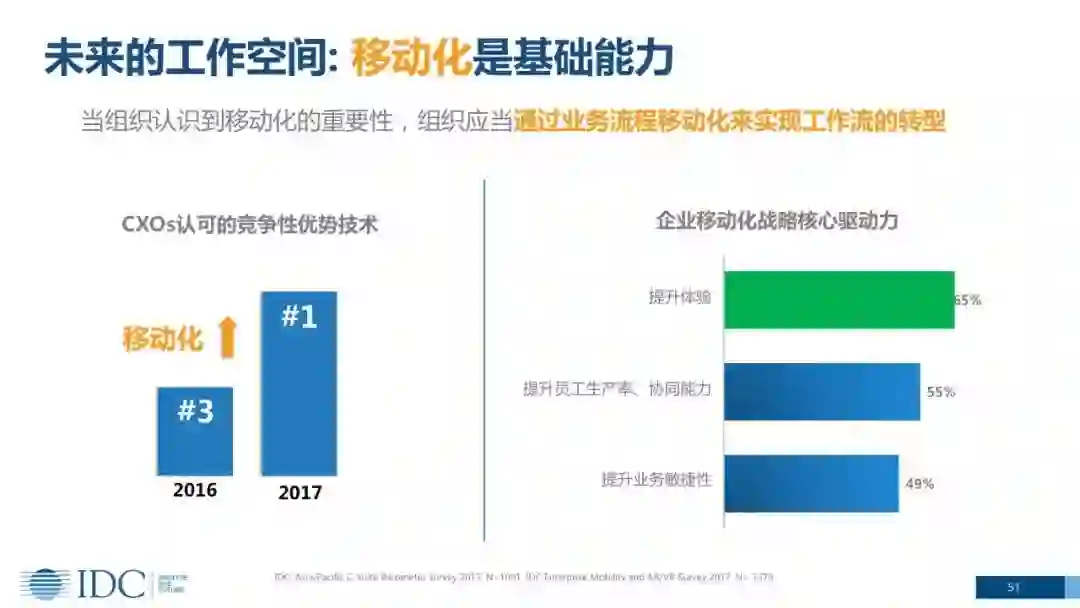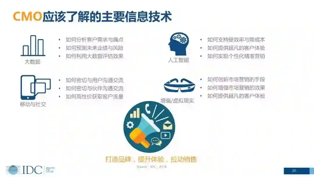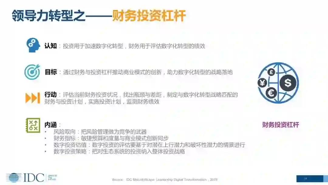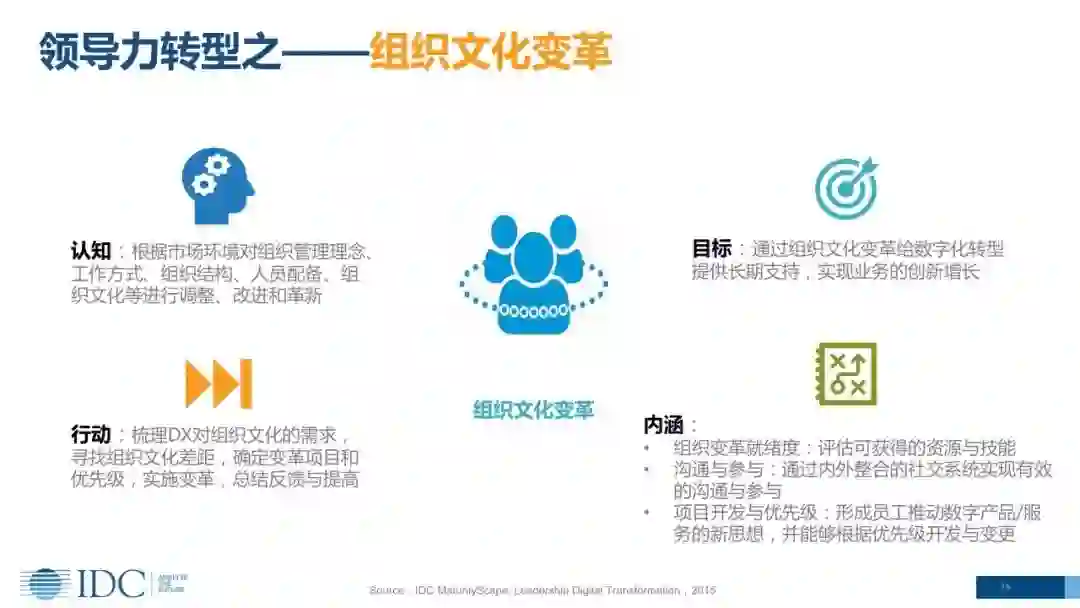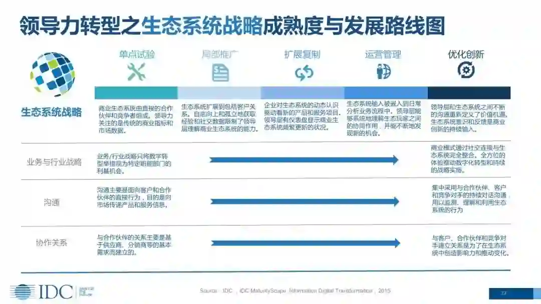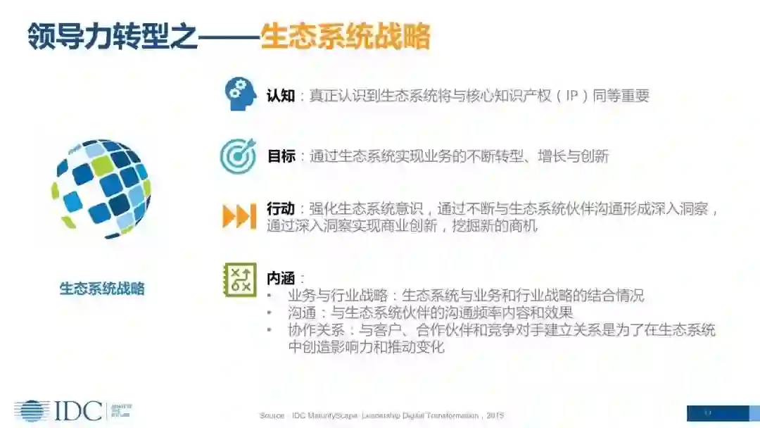数字化转型是技术支持的业务转型,CXO变成技术型至关重要。IDC预计,到2020年,全球2000强公司中1/3 的CEO和COO等至少在技术领导领域有5年工作经验 。