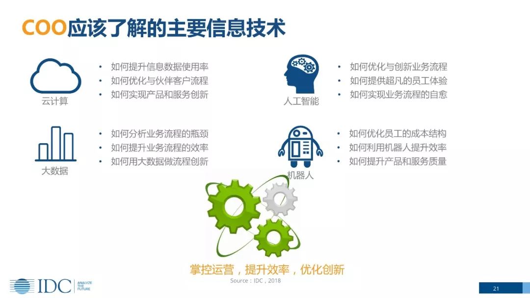 到2021年,15%的中国2000强制造业企业将会利用物联网、区块链、认知技术、机器人,实现大规模的流程自动化,并将执行时间缩短高达25%(IT/OT融合)。