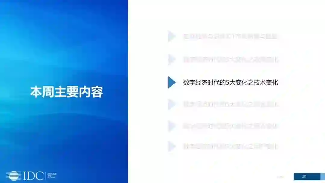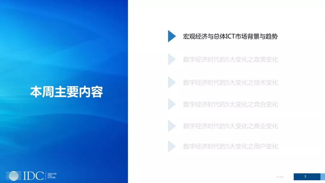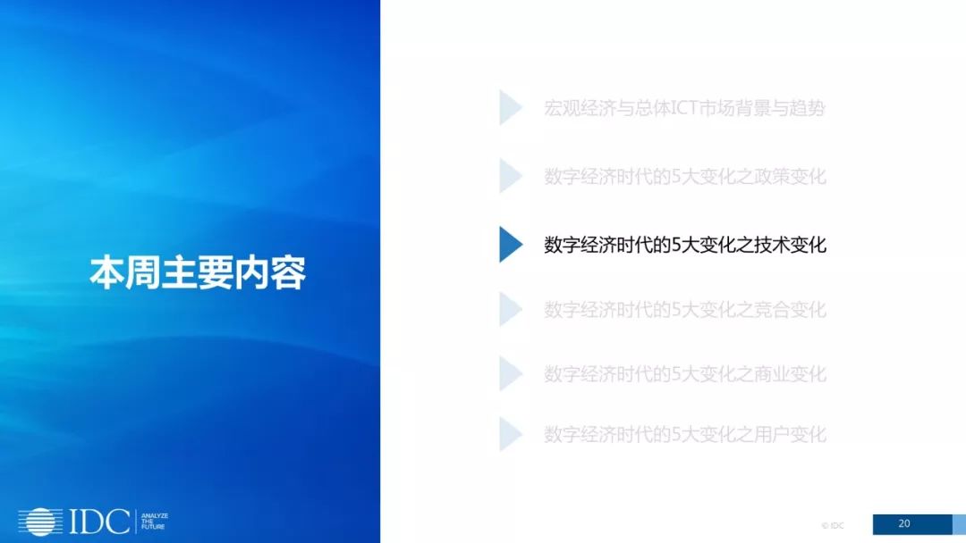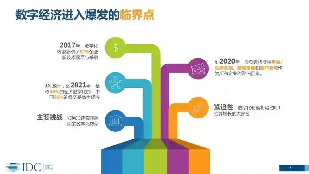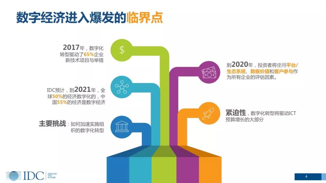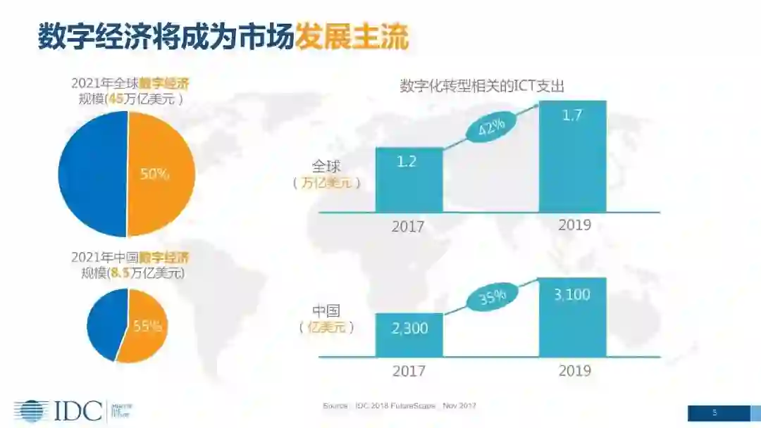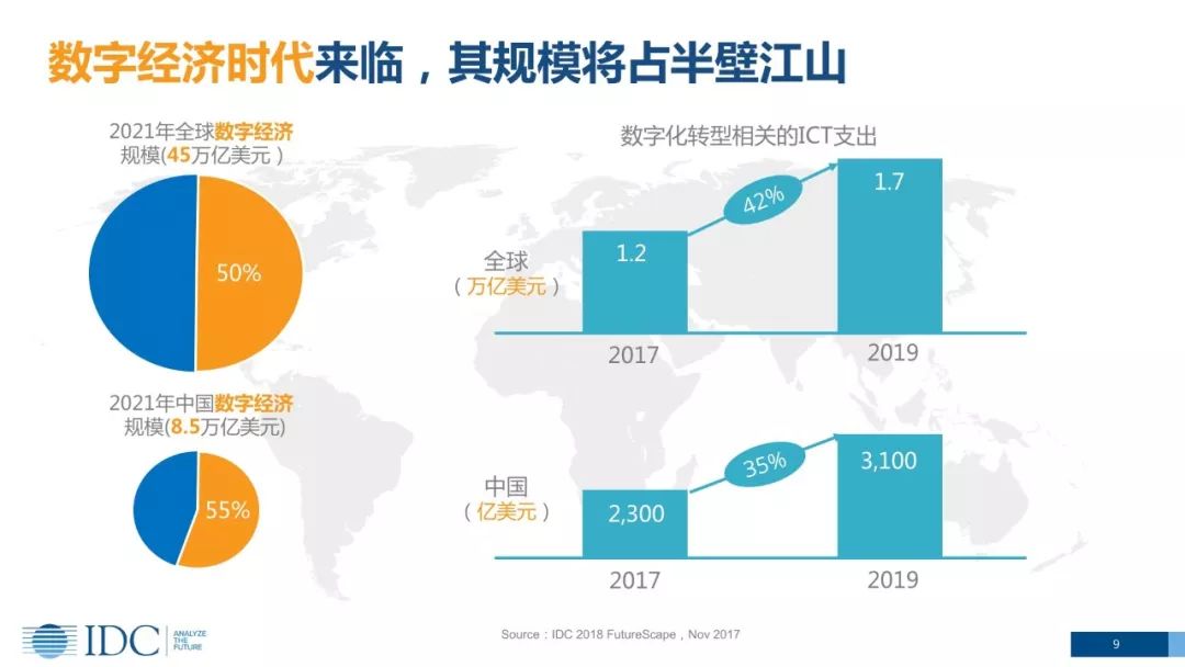 数字经济已经成为市场的主流。IDC预计,到2021年,全球50%的GDP都将是数字化的,中国数字经济的比例至少将达到55%。