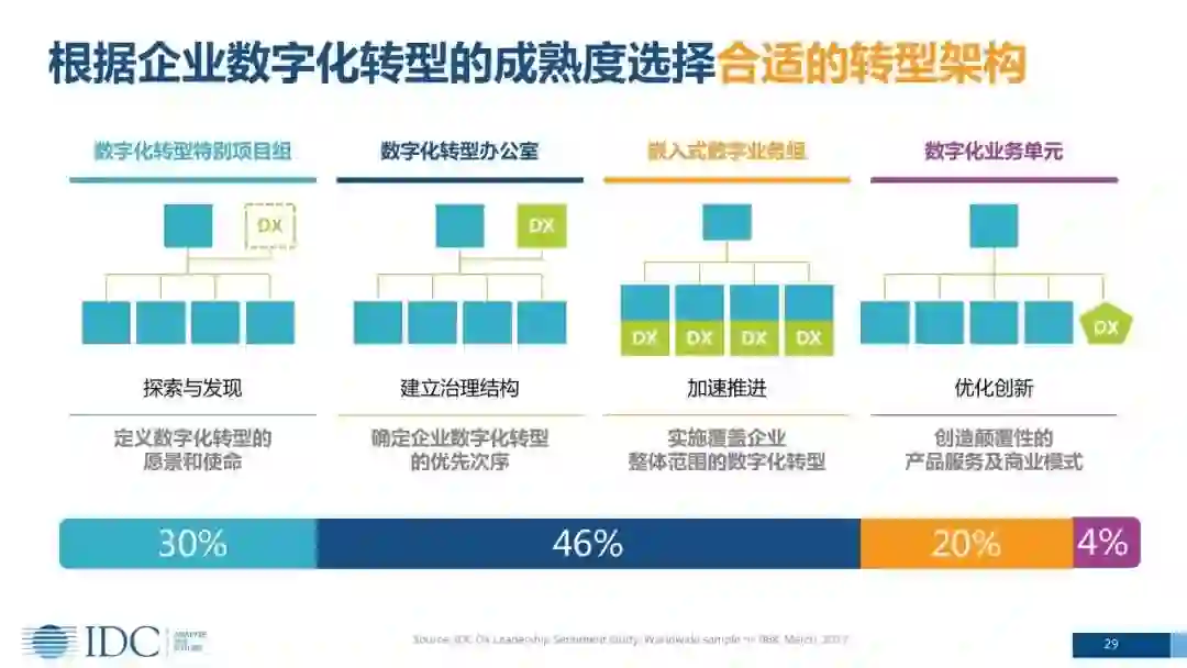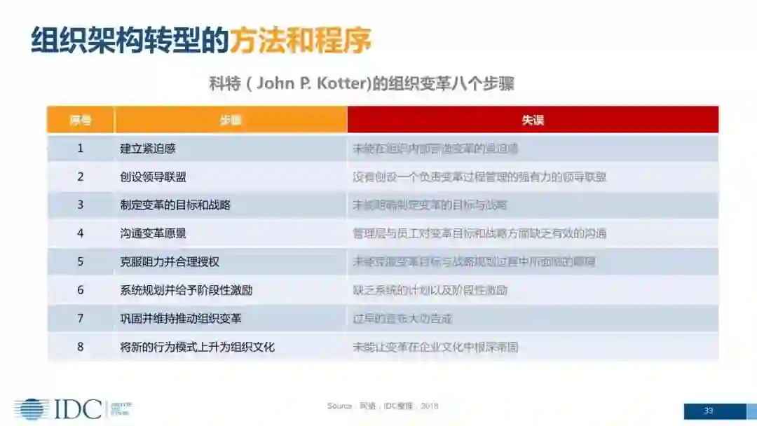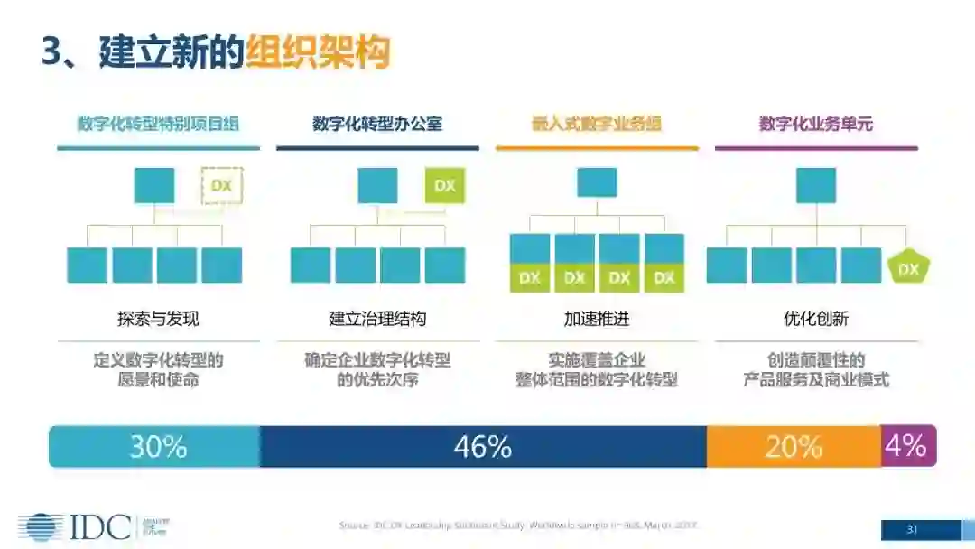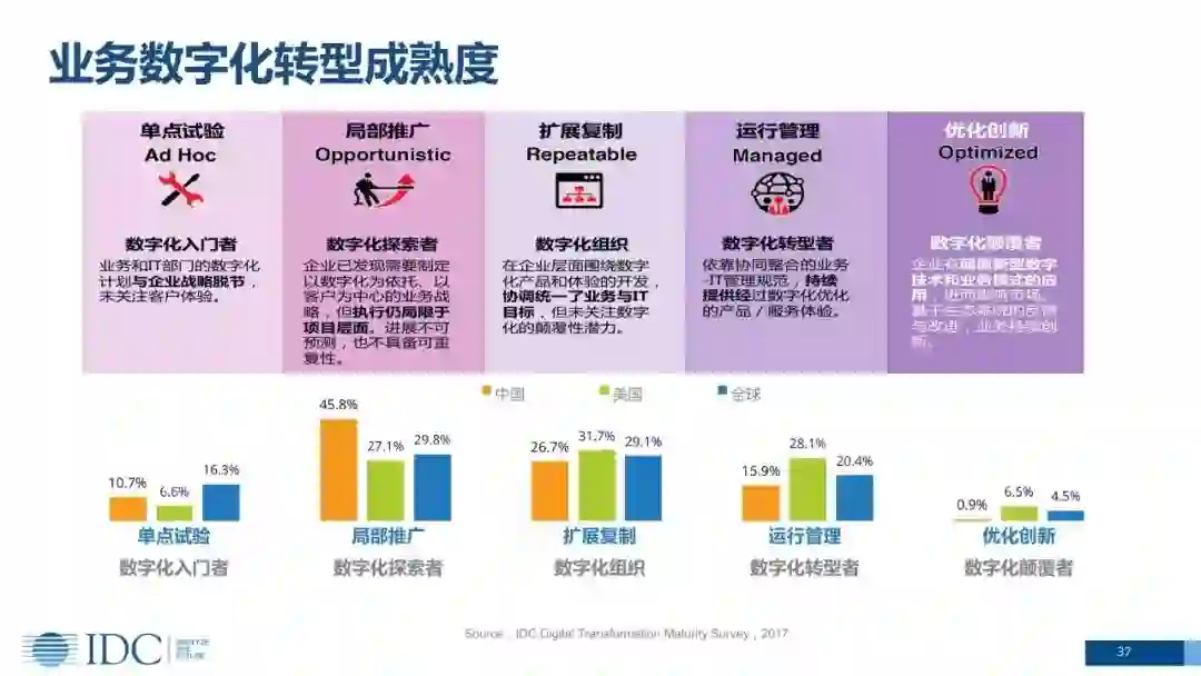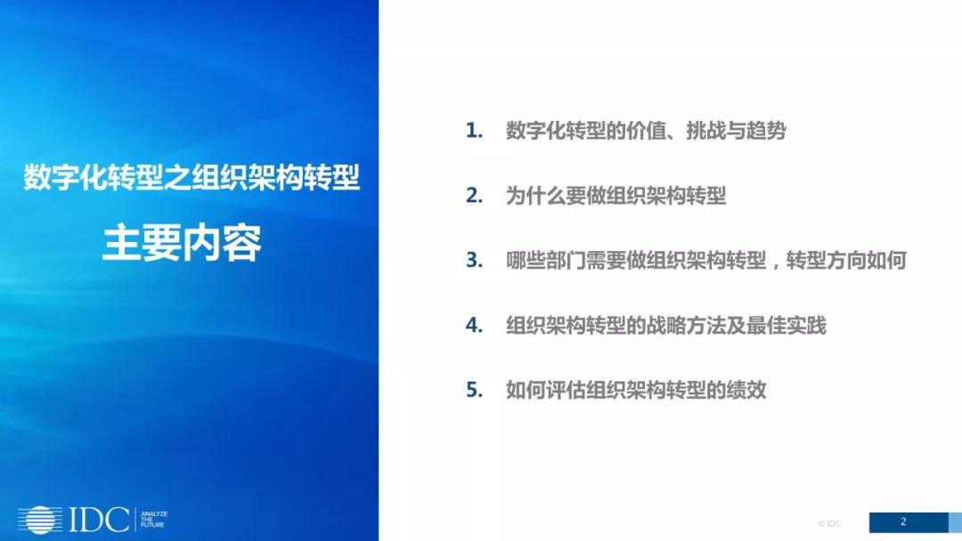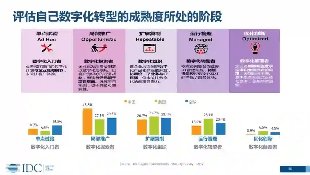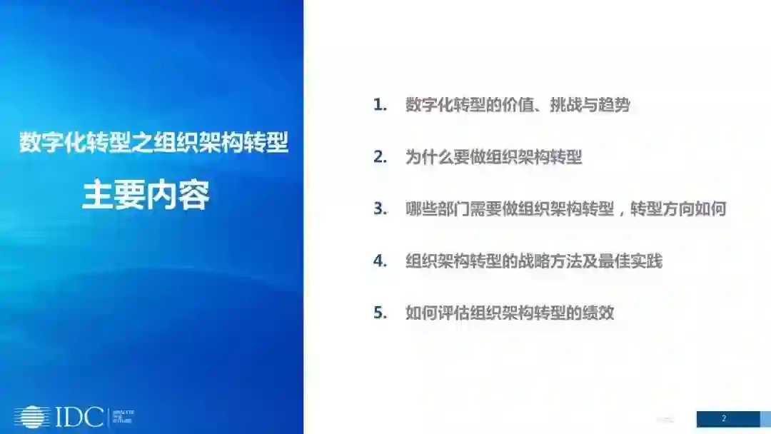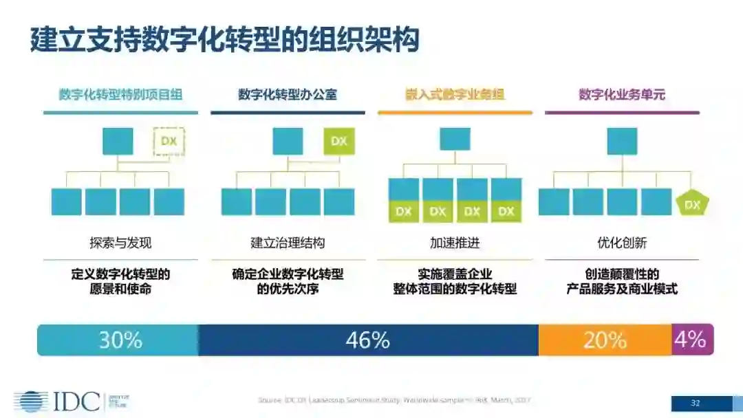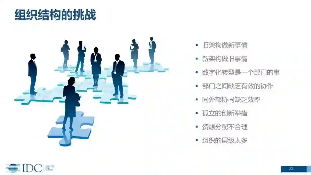 数字化转型不是一朝一夕的事,而是一个十年的旅程。根据IDC的研究,全球59%的组织处于数字化转型的第二、三阶段,即数字化转型的僵局阶段。组织架构转型是基础,不实现组织架构的转型很难进入第四、五阶段。