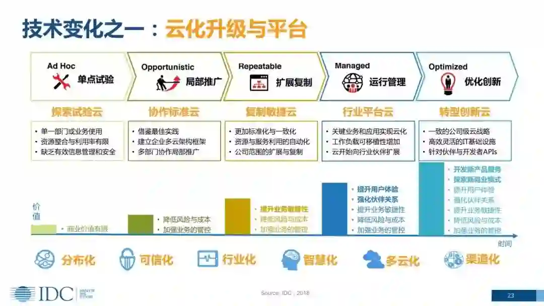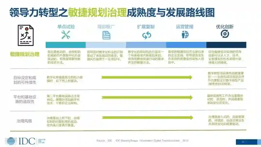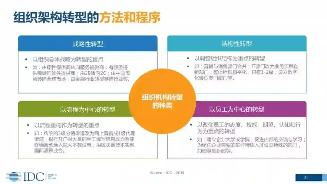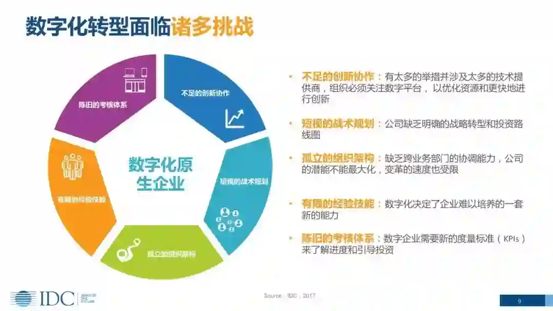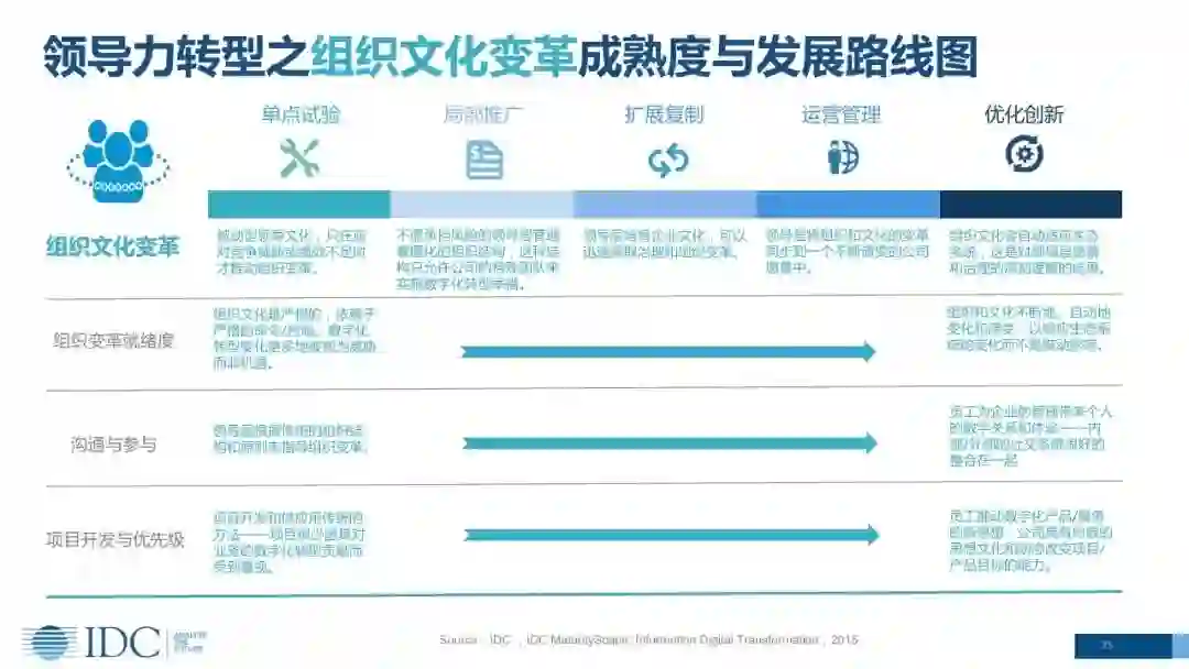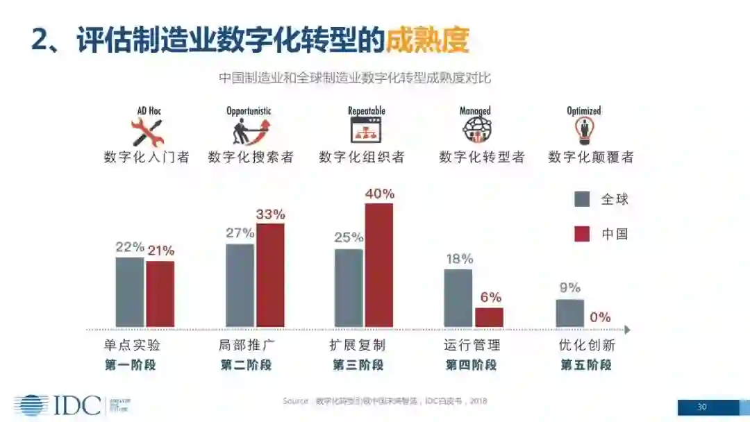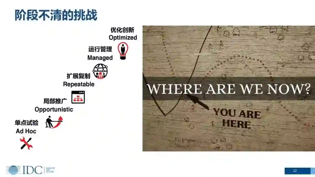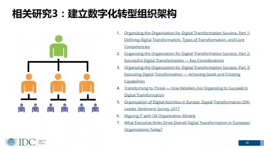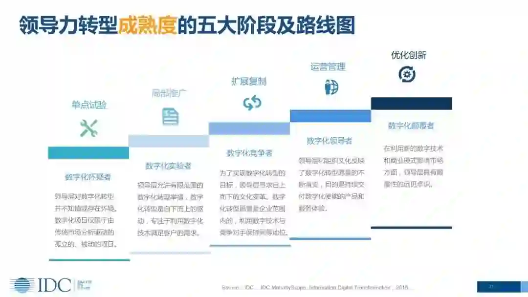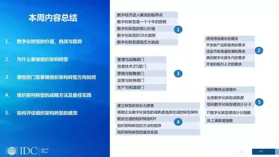 数字化转型不是一朝一夕的事,而是一个十年的旅程。根据IDC的研究,全球59%的组织处于数字化转型的第二、三阶段,即数字化转型的僵局阶段。组织架构转型是基础,不实现组织架构的转型很难进入第四、五阶段。