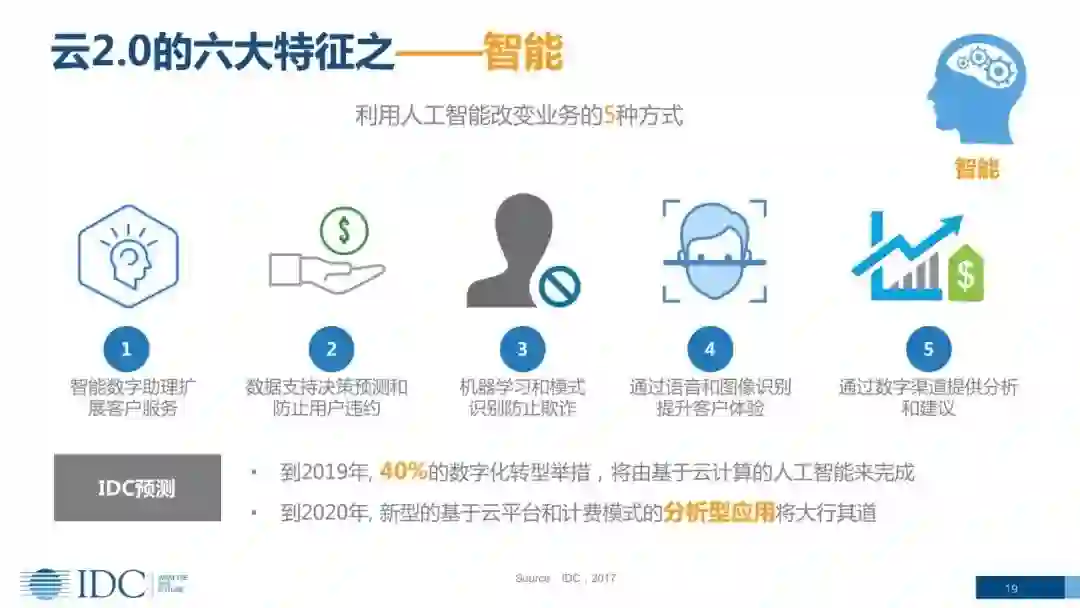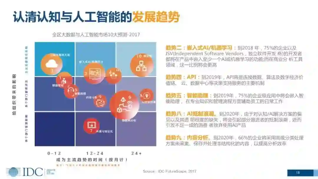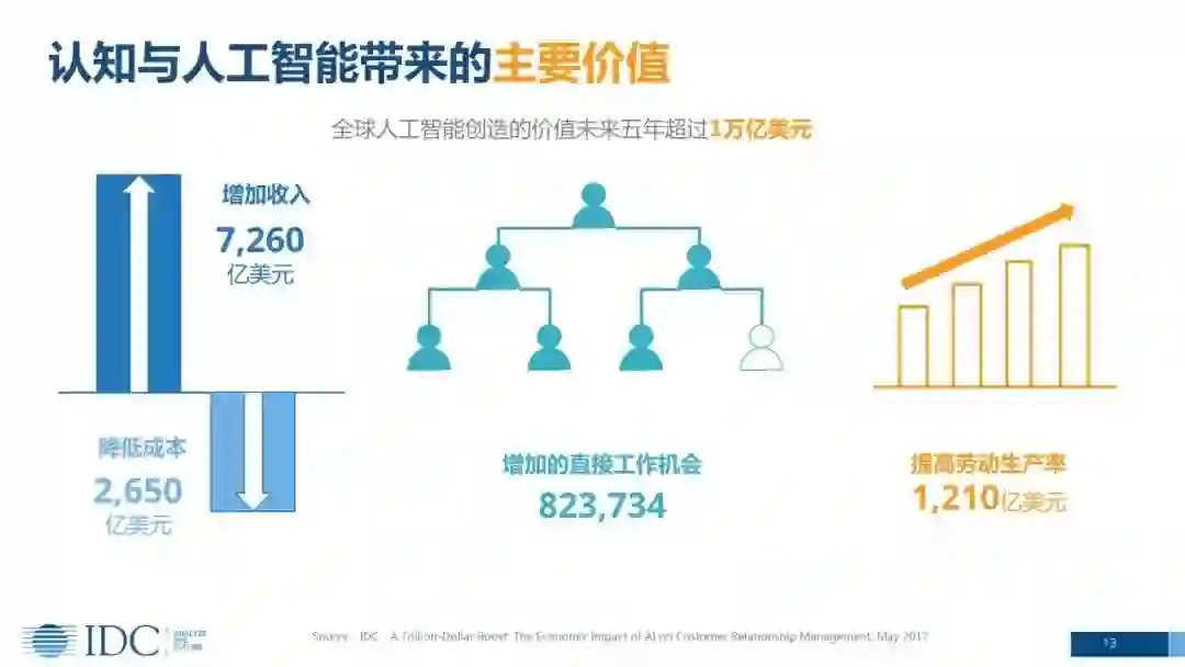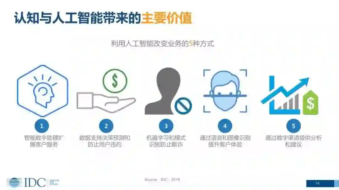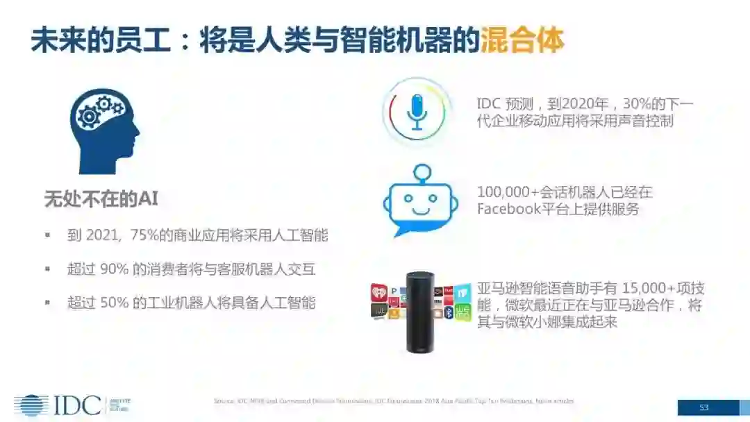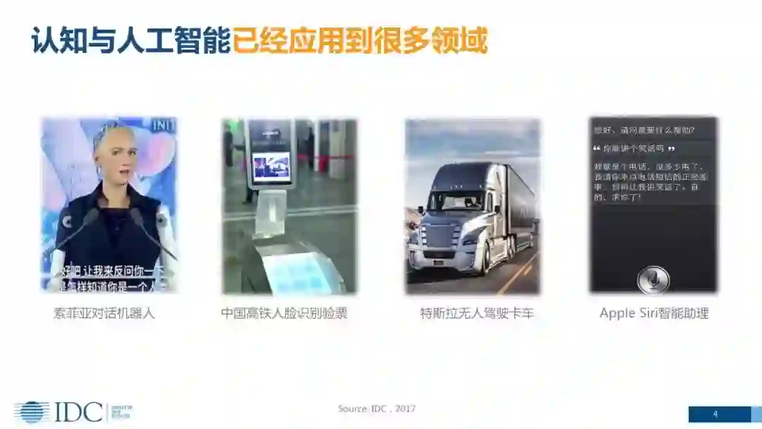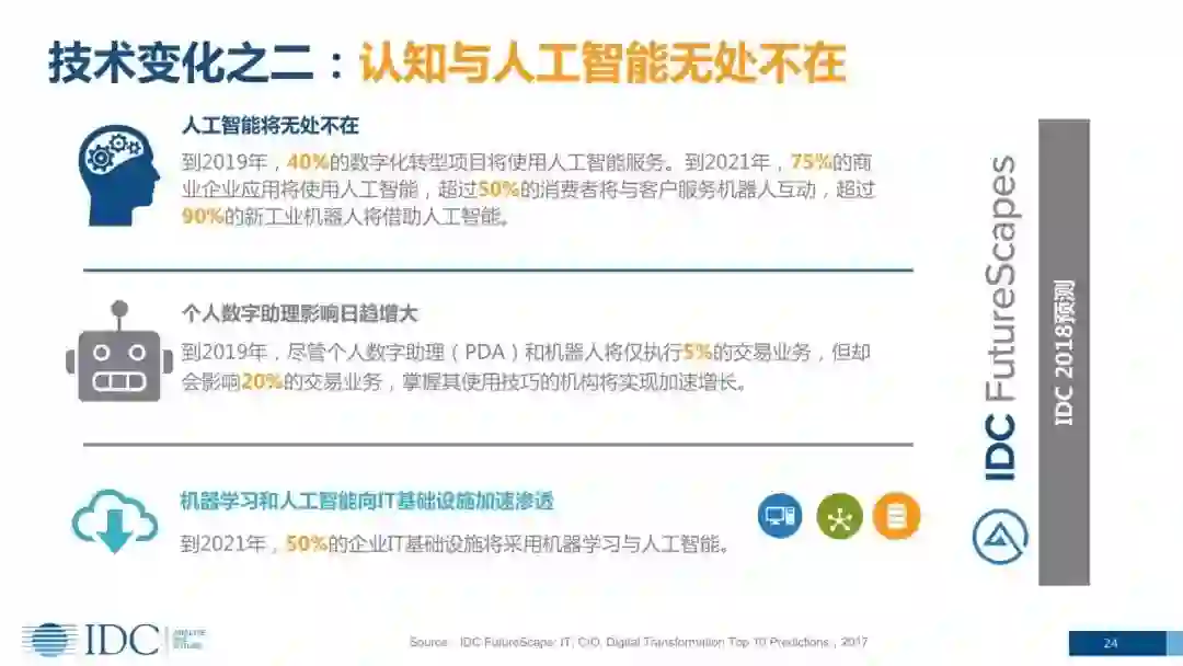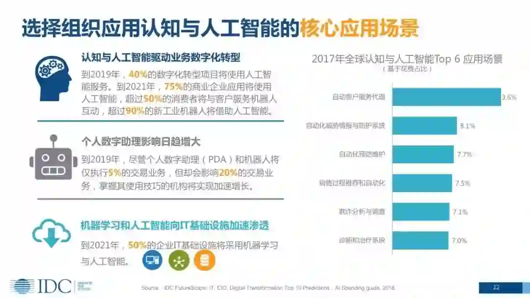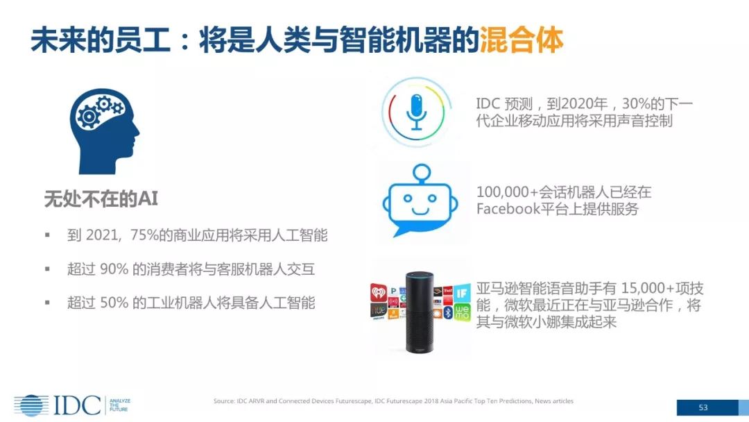 知与人工智能未来将无处不在。根据IDC的研究,到2019年,40%的数字化转型项目将使用人工智能服务。到2021年,75%的商业企业应用将使用人工智能,超过50%的消费者将与客户服务机器人互动,超过90%的新工业机器人将借助人工智能。