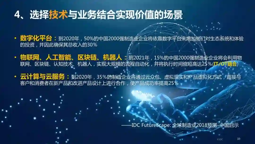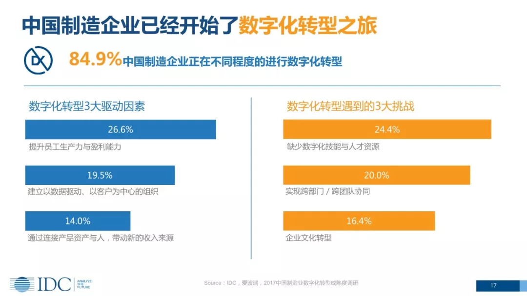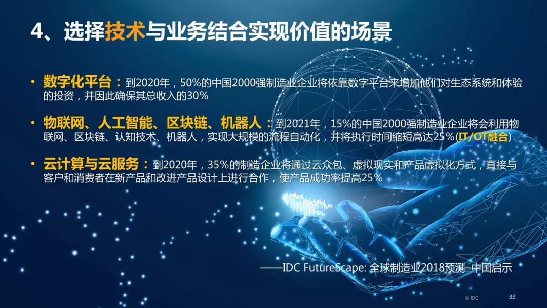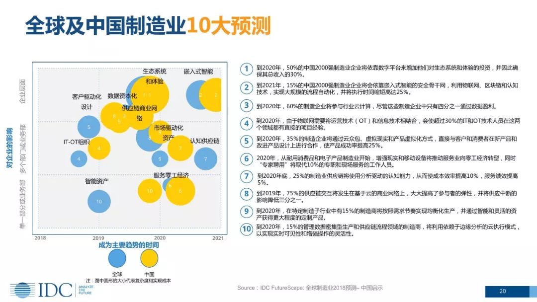 IDC预计,到2020年,50%的中国2000强制造业企业将依靠数字平台来增加他们对生态系统和体验的投资,并因此确保其总收入的30%。