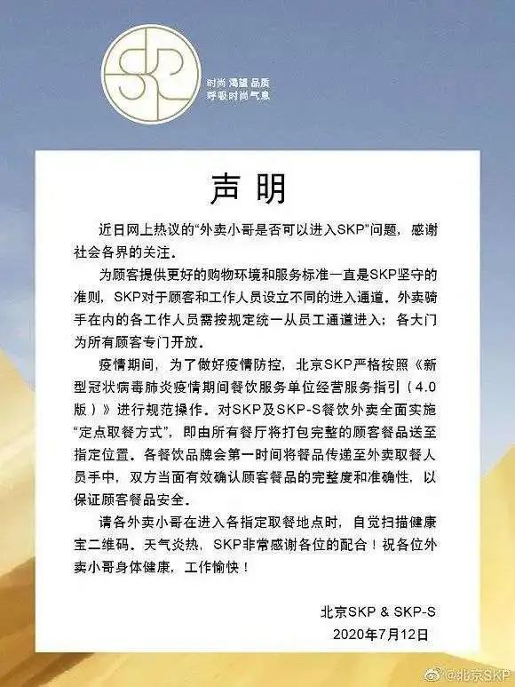 SKP 好高贵哦。 工作服还分三六九等吗?SKP 制服就更高级吗?外卖服就低级吗? 我不知道是什么给 SKP 这种盲目的阶 级感。 这就是系统性的对外卖服务行业的歧视。 我不会去你们家消费任何一样东西,我也呼吁大家不要再去消费了。