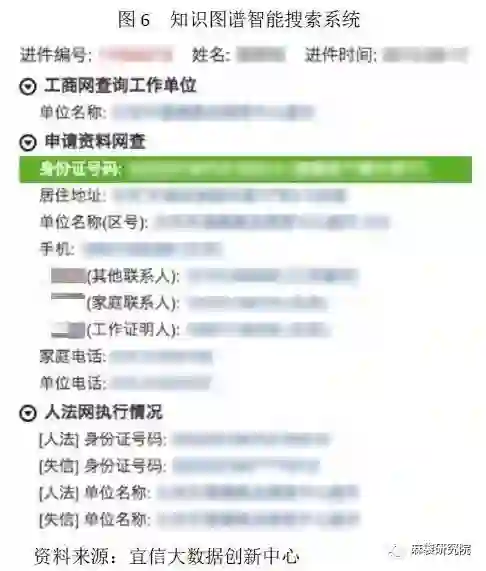 图6是宜信的智能搜索系统。该系统不仅利用公司内部积累的历史数据,还用爬虫覆盖了100多个公开网站,如人法、工商、百度、生活服务类以及十几家网贷黑名单等。通过在系统中搜索借款申请人的身份证号,就可以索引出与申请人相关的全部信息。