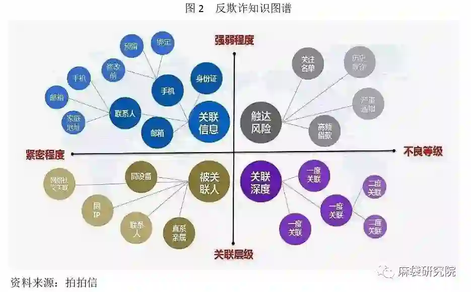 同时,知识图谱还可以有效甄别团体欺诈。甄别团体欺诈的方式有两种:第一,根据之前标记的黑名单客户,利用知识图谱确定与其有紧密联系的欺诈用户。根据调查,与黑名单客户有大量关联的借款用户的坏账率通常是未关联用户的2.9倍;第二,根据团体欺诈会共享部分信息的特点,利用知识图谱发现不同用户之间的信息关联性,从而识别欺诈团体。