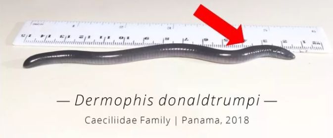 现任美国总统特朗普也有以自己名字命名的物种——Dermophis donaldtrumpi,一种没有脚的两栖动物。拍到命名权的建筑公司表示希望借此次的命名来提高人们对气候变化的认识,而特朗普也在制定一系列与气候息息相关的政策。