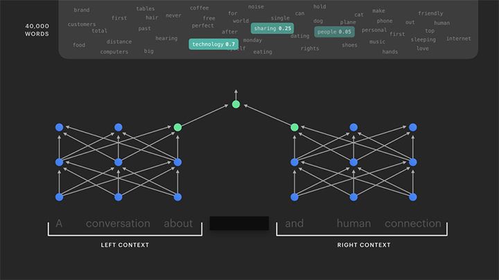 例如,我们训练了这些自我监督系统中的一个,通过在句子中隐藏单词来更好地理解语言,即使模型以前从未见过原来的句子。如果有一个短语,比如「A conversation about ________ and human connection」,人们可以很容易地猜出几个词来填补这个空白。但这项任务对人工智能来说更具挑战性。这是一个有用且可扩展的训练任务的基础,和谷歌引入的 BERT 模型所解决的任务类似。我们可以依次删掉句子中的每个单词,然后在 10 亿个单词的数据集上重复这个过程,且这些单词不需要进行标记。