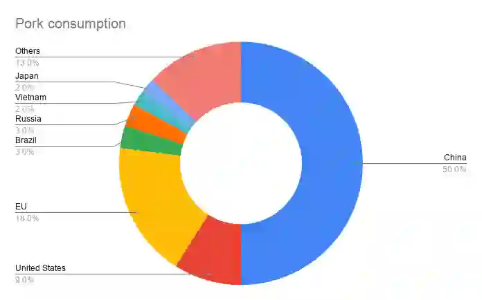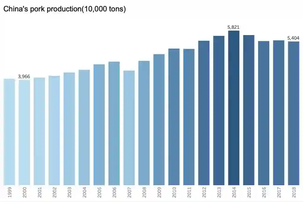 中国饲养了近7亿头猪,相当于全球猪肉供应量的一半以上。在过去的10年里,中国人均猪肉消费量超过30公斤,猪肉,是我们最常食用的肉类。2016年,国内猪肉销售额最高达到1.4万亿元人民币,占全年GDP的近2%。2018年,中国居民总计消费5490万吨猪肉,占肉类总量的62%以上。