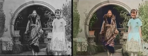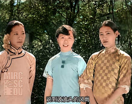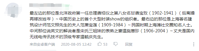 最左边的那位是北洋政府第一任总理唐绍仪之第八女名甘唐宝玫(1902-1941)(后离婚再嫁改姓岑)~中国历史上的首个大型时装show的组织者。最右边的那位是上海著名建筑设计师范文照先生的夫人范萧宝莲(1909-1984)~民国时期上海滩社交圈知名人士。中间那位说英文的解说者是宋氏三姐妹的表弟之妻温施惠珍(1906-2004)~丈夫是国内无线电传讯技术的顶级专家温毓庆先生。