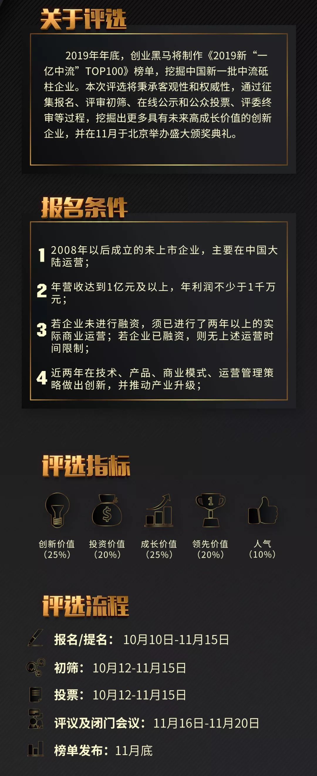 2019年年底,创业黑马将制作榜单《2019创业黑马TOP100:寻找一亿中流》,挖掘中国新一批中流砥柱企业。
