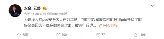 原阿里集团安全研究实验室总监云舒发微博称,某安全团队老大在5年即将到期,可以拿取股票时,突然被开除,而被开除的原因是「不愿做黑客攻击」。
