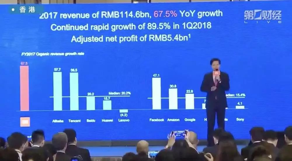 2017年,小米收入年增长67.5%,今年一季度加速增长,在89.5%。2017年,小米的互联网收入达99亿人民币,毛利率超过60%。雷军表示,如果不考虑电商的话,这99亿人民币的收入也能使小米进全球互联网公司的前25名。