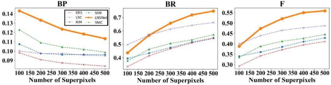 首先,我们在 BSDS 数据集上进行了实验,可以看到我们提出的超像素分割策略在 ASA、BR、F 等常用超像素评价指标中都远高于其余无监督的超像素分割方法(包括传统方法 SLIC、LSC、ERS,RIM)。此外,相比于依赖分割标签的有监督超像素分割方法 SSN,由于我们的方法在训练过程中无法感知到高层语义信息,导致分割结果会产生相对较多的冗余超像素块,这点造成了我们的方法的分割精确性较低,因此在 ASA 及 F 指标中略低于 SSN。然而这一特点也使得我们的模型具有更好的分割召回率,对于一些复杂场景中的模糊边缘的拟合性更好,因此我们的方法可以取得更高的 BR 指标