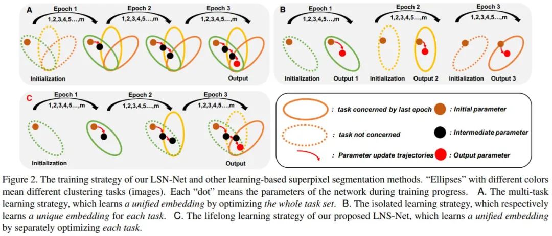与这两种方式不同,本文希望利用持续学习策略,保证超像素分割方法既可以既借助卷积神经进行更为有效的特征提取,又同时兼顾传统超像素分割方法高效、灵活、迁移性强的特点。