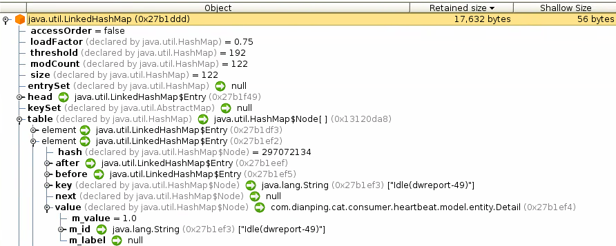现有代码采用 java 标准库中的 LinkedHashMap 来表示这些层次结构,这也就产生了大量 LinkedHashMap 以及子对象 LinkedhashMap$Entry,从下面堆 dump 的内存文件分析看到这几个 package 的对象在内存占用按照类型排行上非常靠前:
