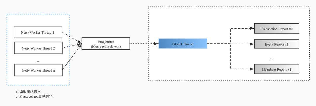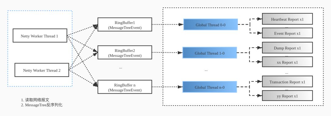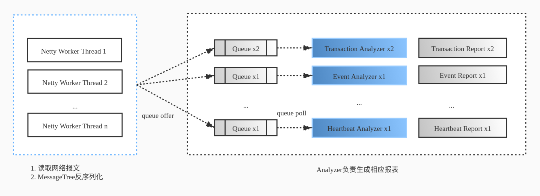 下图描述了 CAT 的消息处理和线程模型,Netty Worker 线程生成 MessageTree 后,offer 到每个 Analyzer 专有队列(Blocking Queue)中,由 Analyzer 线程从队列中拉去后处理并生成对应的内存报表。
