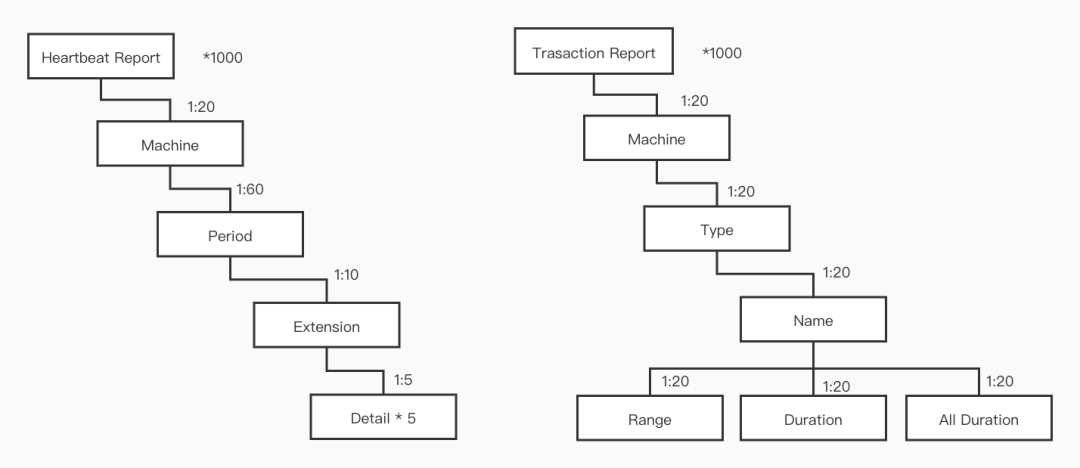 从 CAT 的 heap dump 中我们看到最大的对象主要是当前小时的各种 Report 对象, 这些 Report 大量使用了多层级的 Map 结构,如下图 (图中的数字是经验估计数量)。可以看到 Map 对象非常多, 特别是层次往下的那些对象。
