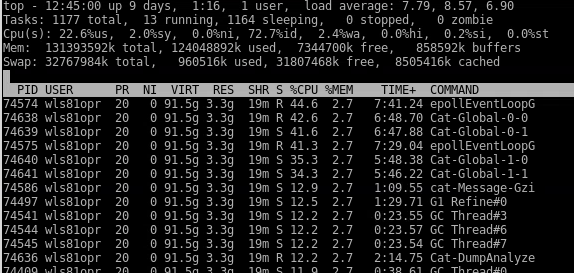 改造后测试环境的这台服务器顺利跑了起来, 在小时消息量 0.94 亿,消息大小 210G 情况下 “top -H” 输出如下, 可以看到 Netty work 线程 (图中 epollEventLoopG)的占用不高,4 个全局的 Analyzer 线程 (图中 Cat-Global 开头线程) 的占用也不太高,无消息丢失。